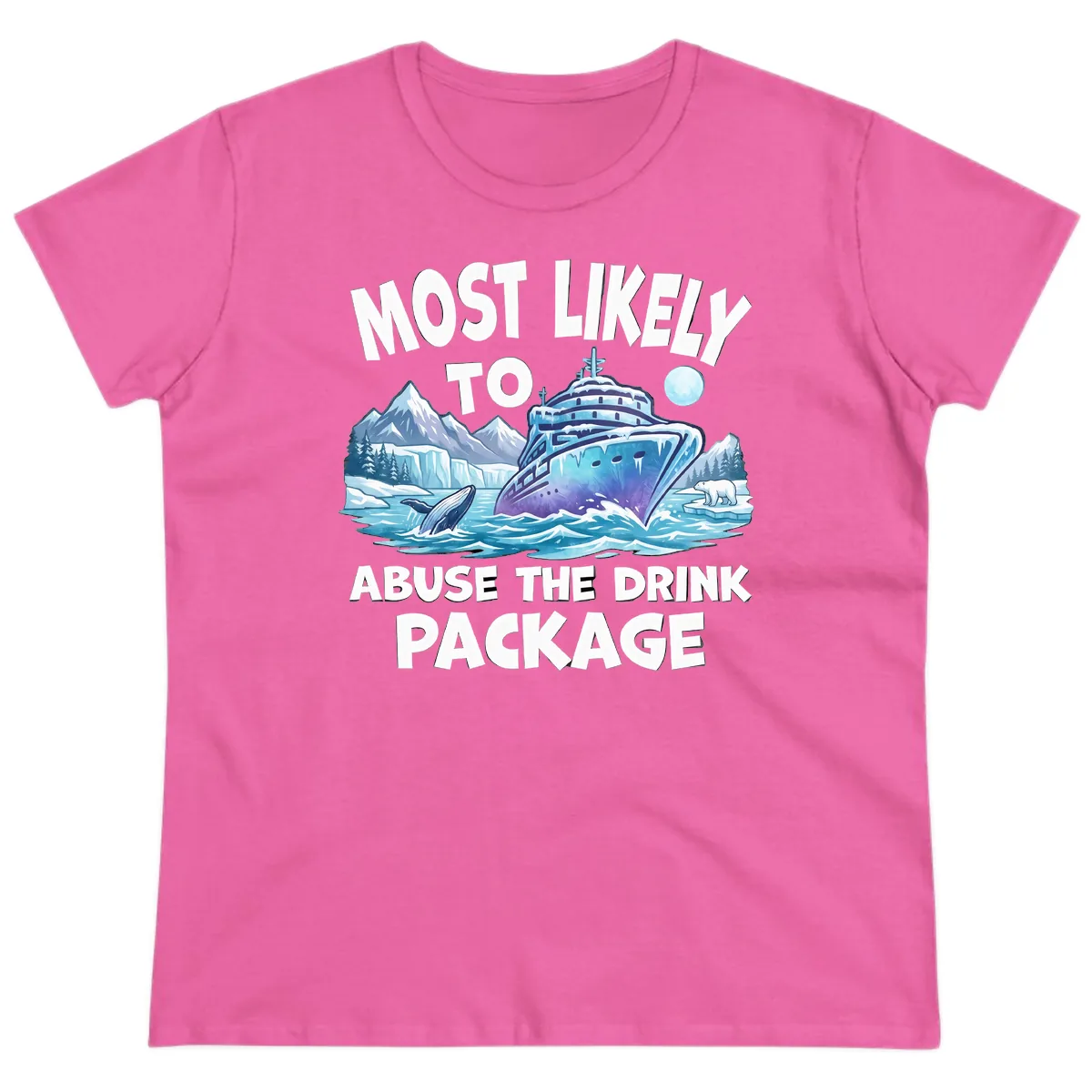 Get ready for endless compliments with our "Most Likely To Abuse The Drink Package" Ladies Tee! This design is as fun and vibrant as your vacation, featuring a stunning Arctic backdrop with a cruise ship sailing past whales and polar bears. It’s the perfect way to express your cruise spirit with a touch of humor and style.