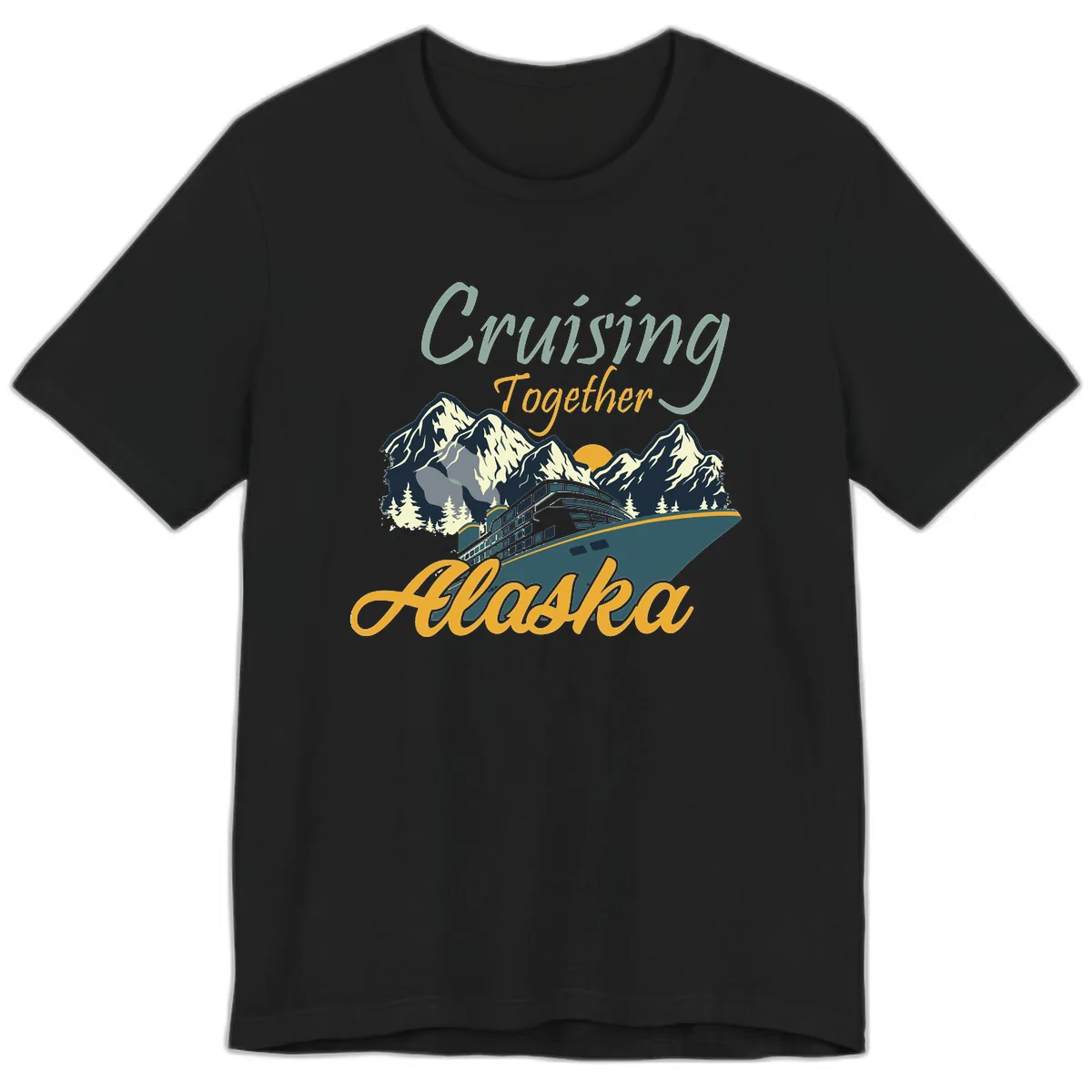 Experience the grandeur of Alaska in style with our "Cruising Together Alaska" premium tee. This shirt boasts a breathtaking scenic design, complete with a modern cruise ship navigating icy waters against a backdrop of towering, snow-dusted peaks and vibrant evergreen forests. The elegant text is designed to be a lasting reminder of your shared journey.