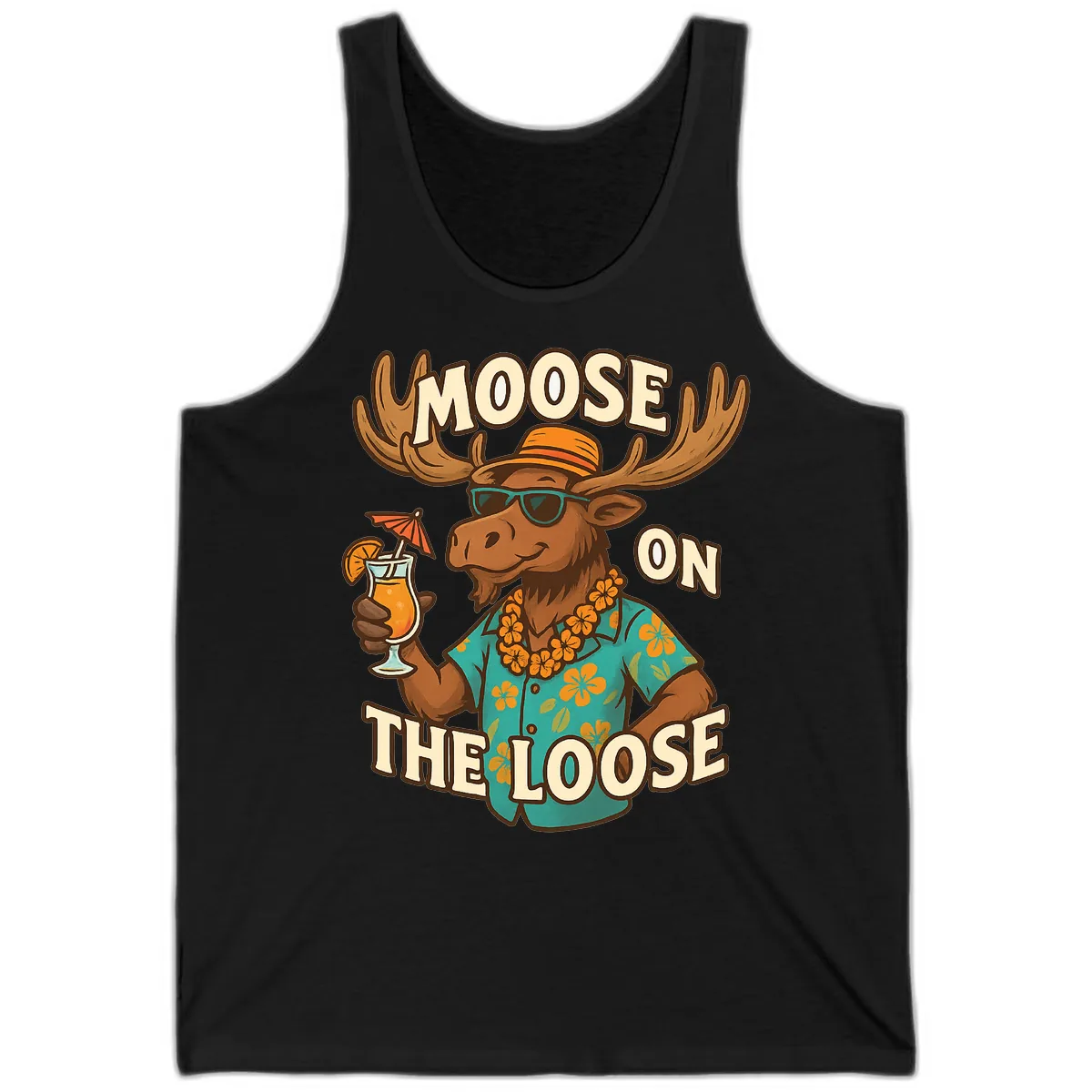 The fun and vibrant 'Moose On The Loose Tropical' design stands out on the tank top, showcasing the hilarious moose in his vacation best. It's a perfect way to bring a playful vibe to your cruise attire.