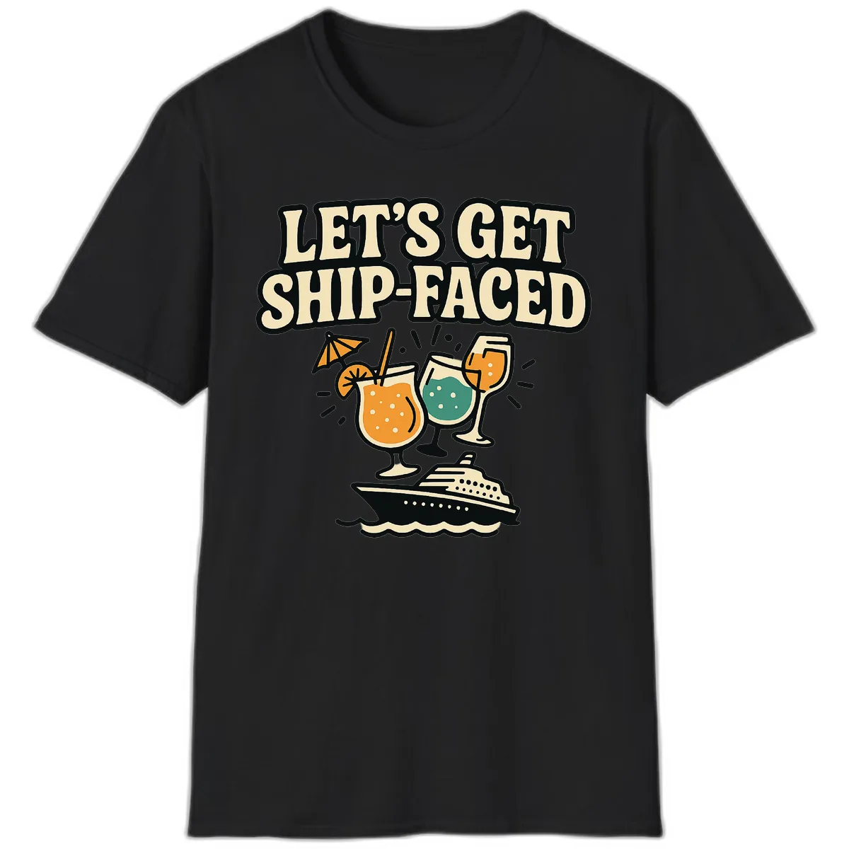 This T-shirt features a fun, retro illustration with the cheeky phrase 'LET'S GET SHIP-FACED' surrounded by festive cocktails, a cruise ship, and ocean waves. It's designed to capture the carefree spirit of a cruise vacation.