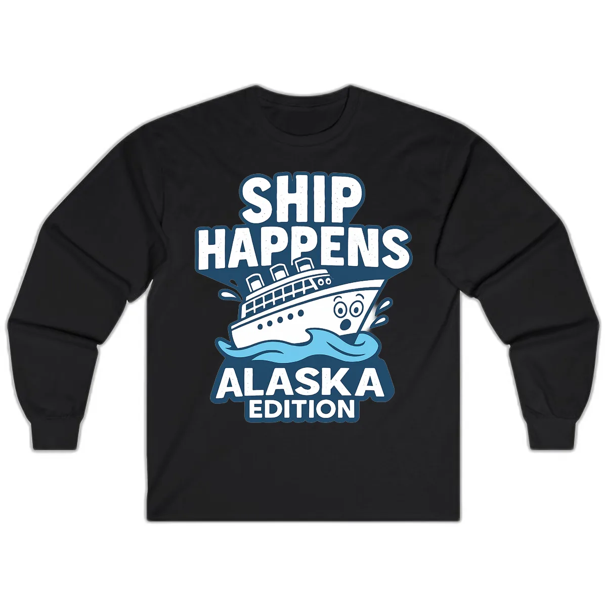The 'Alaska Edition' specifically ties the popular 'Ship Happens' pun to your Alaskan voyage. On a long sleeve, it offers a practical yet humorous way to commemorate your trip, especially useful for those cooler moments at sea.