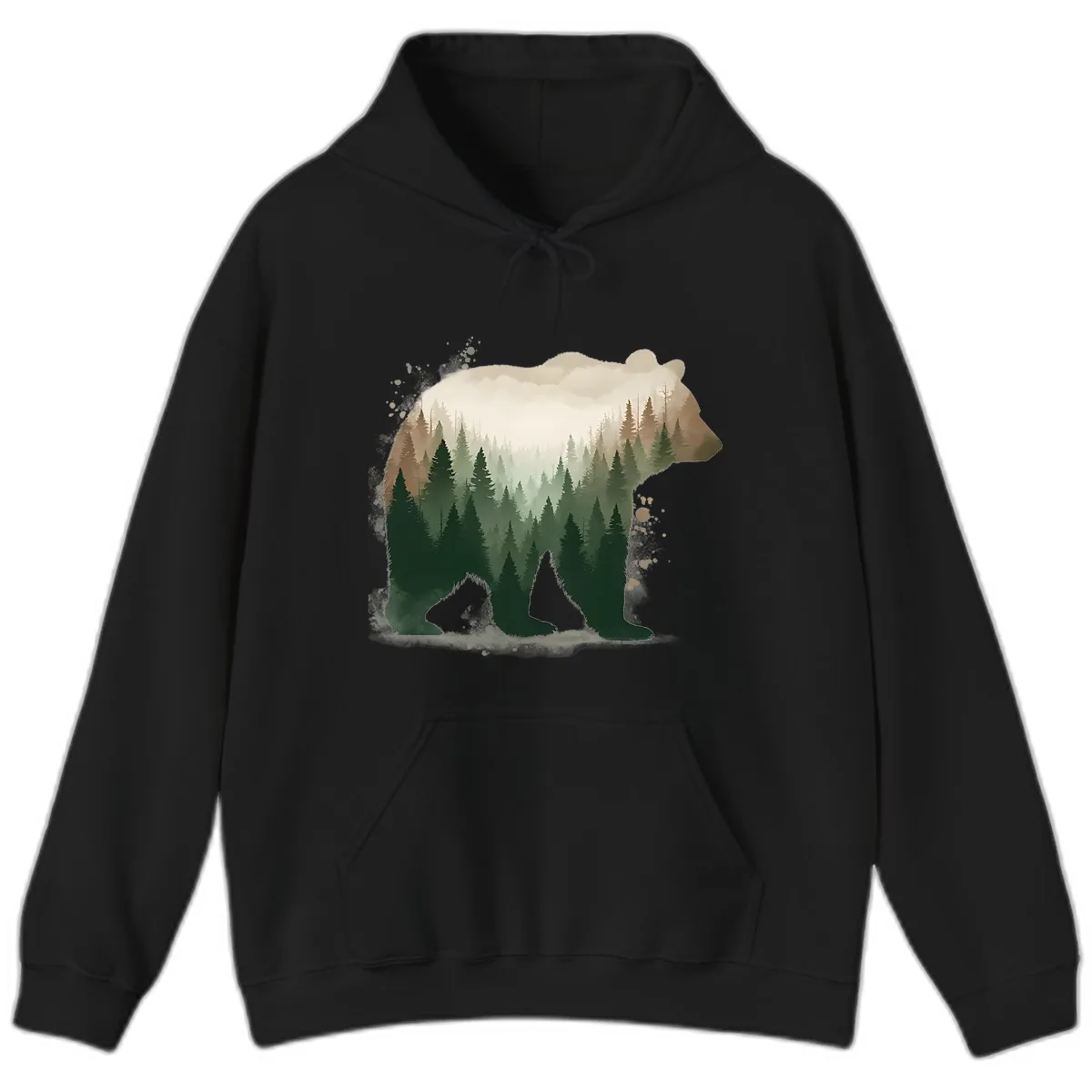 Yes, the intricate double-exposure graphic of the bear silhouette filled with a forest and mountain landscape is printed vibrantly on the front, making a striking visual statement.