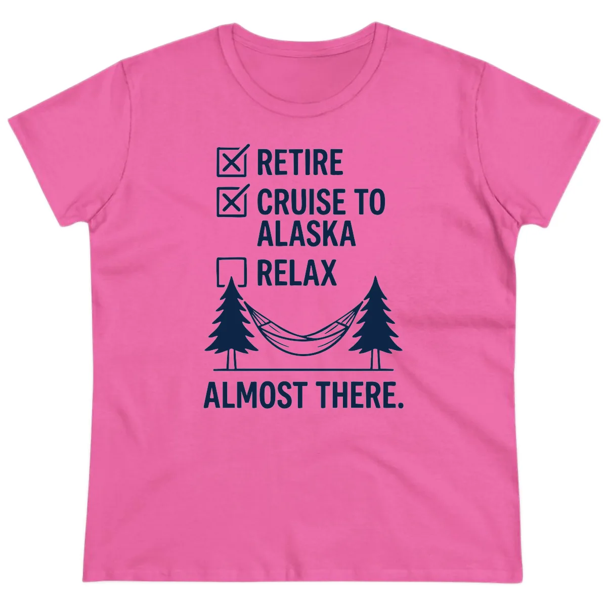 Ladies, get ready to set sail in style and comfort! This "Retire Cruise Alaska Relax" Ladies Tee is designed for the woman who's earned her downtime. Featuring a super fun checklist design, it proudly shows "Retire" and "Cruise to Alaska" as completed missions, with "Relax" just within reach! The charming artwork of evergreen trees and a hammock, paired with the "Almost There" message, is the perfect visual representation of your well-deserved escape to Alaska.
