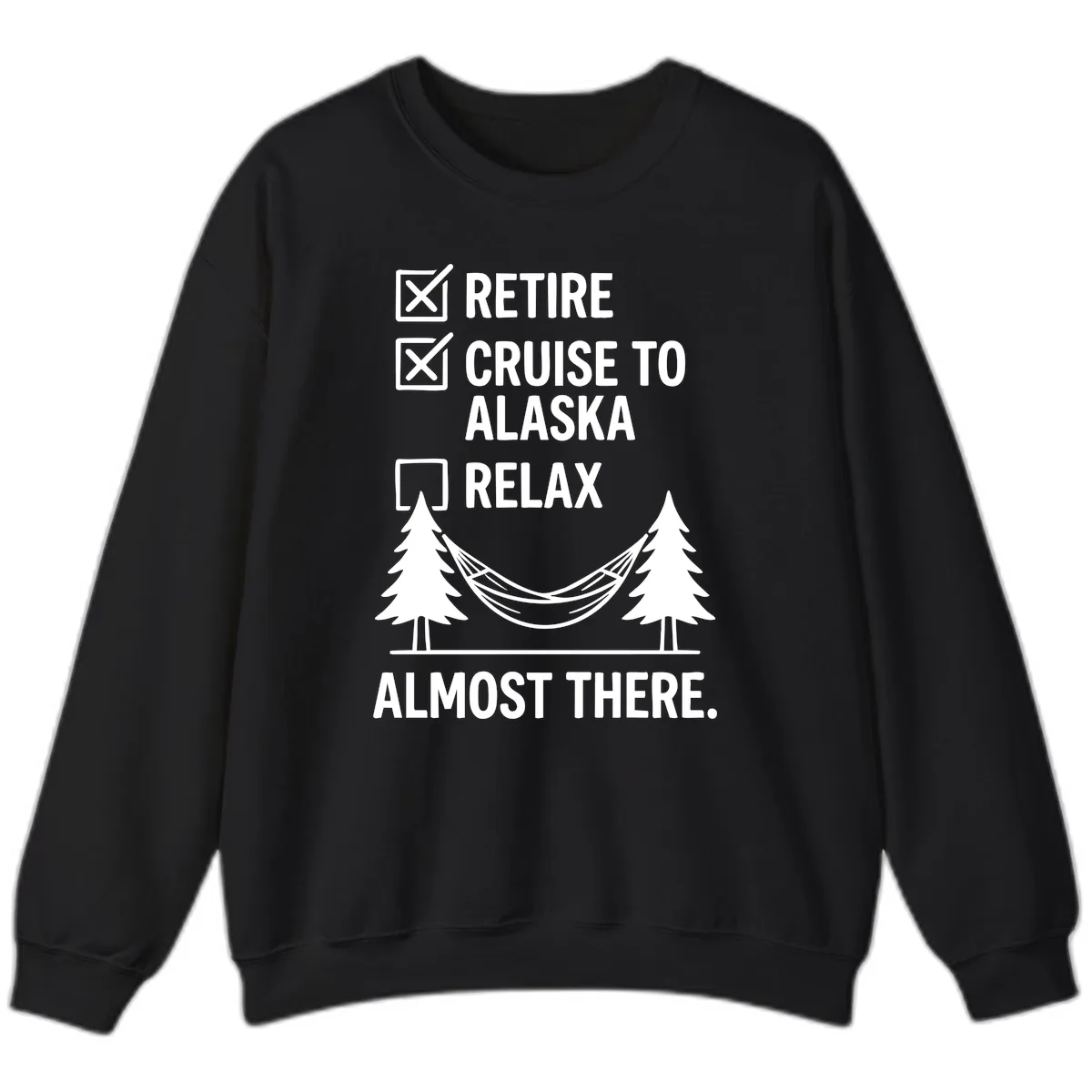 Ready to trade your office chair for a deck chair? Our "Retire Cruise Alaska Relax" Sweatshirt is the ultimate cozy companion for your Alaskan adventure! This crewneck features a hilarious checklist design, showcasing "Retire" and "Cruise to Alaska" as proudly checked items, with "Relax" just around the corner. The charming illustration of evergreen trees framing a hammock, complete with "Almost There" text, perfectly captures that blissful transition from work life to vacation mode.