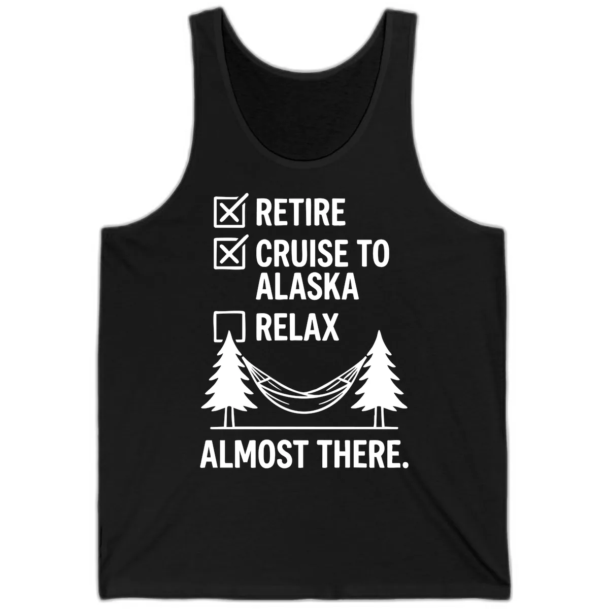 Get ready for sunshine and relaxation with our "Retire Cruise Alaska Relax" Tank Top! This breezy tank is your ultimate companion for warm days on deck or exploring sunny Alaskan ports. It features a hilarious checklist design, boldly displaying "Retire" and "Cruise to Alaska" as checked off milestones, with "Relax" just a breath away. The playful artwork of evergreen trees framing a hammock, complete with "Almost There" text, perfectly captures the essence of your well-deserved downtime.