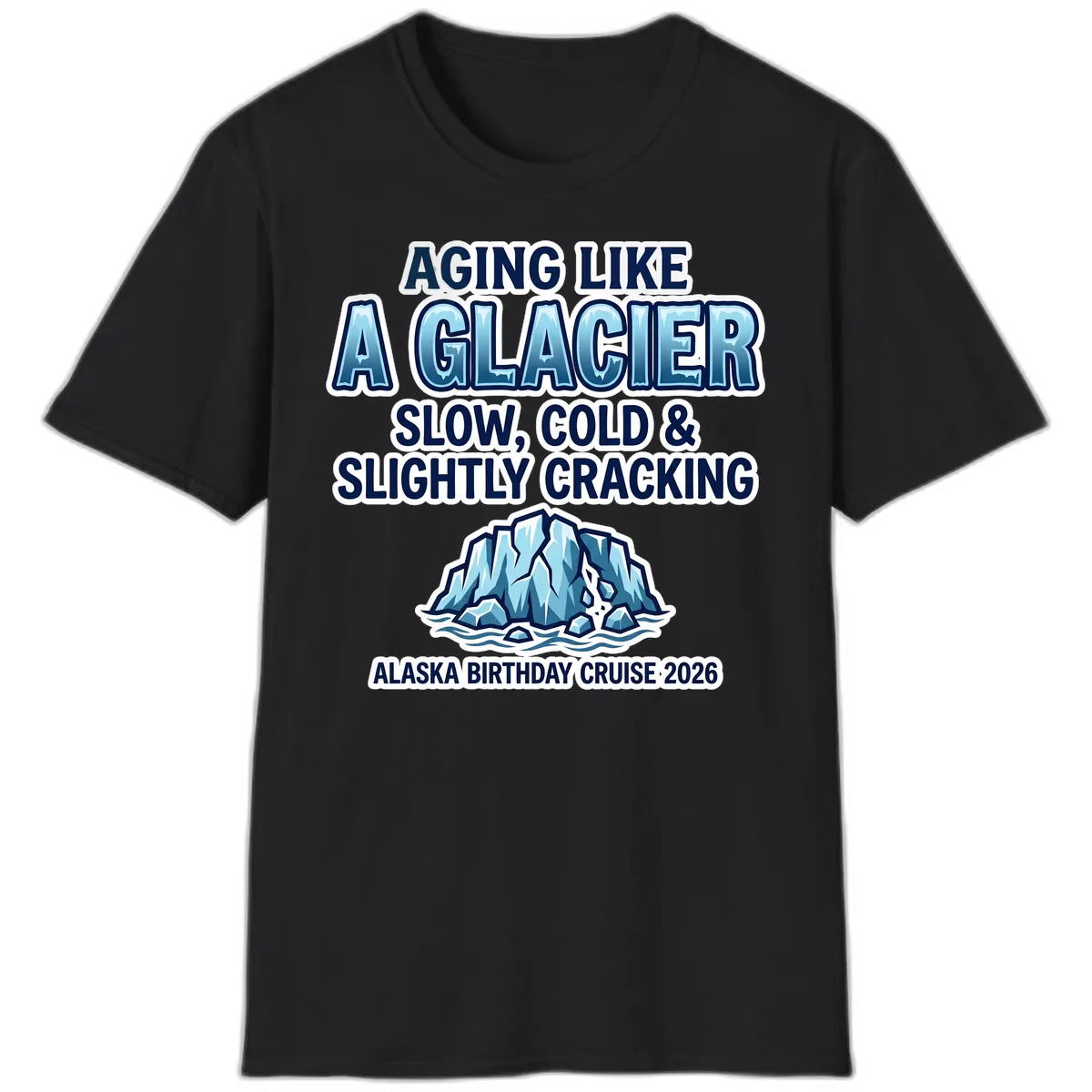 The design is an 'illustrated_text' style. It includes the text 'AGING LIKE A GLACIER,' 'SLOW, COLD & SLIGHTLY CRACKING,' and 'ALASKA BIRTHDAY CRUISE 2026' alongside a detailed illustration of a cracked glacier with ice chunks and waves.