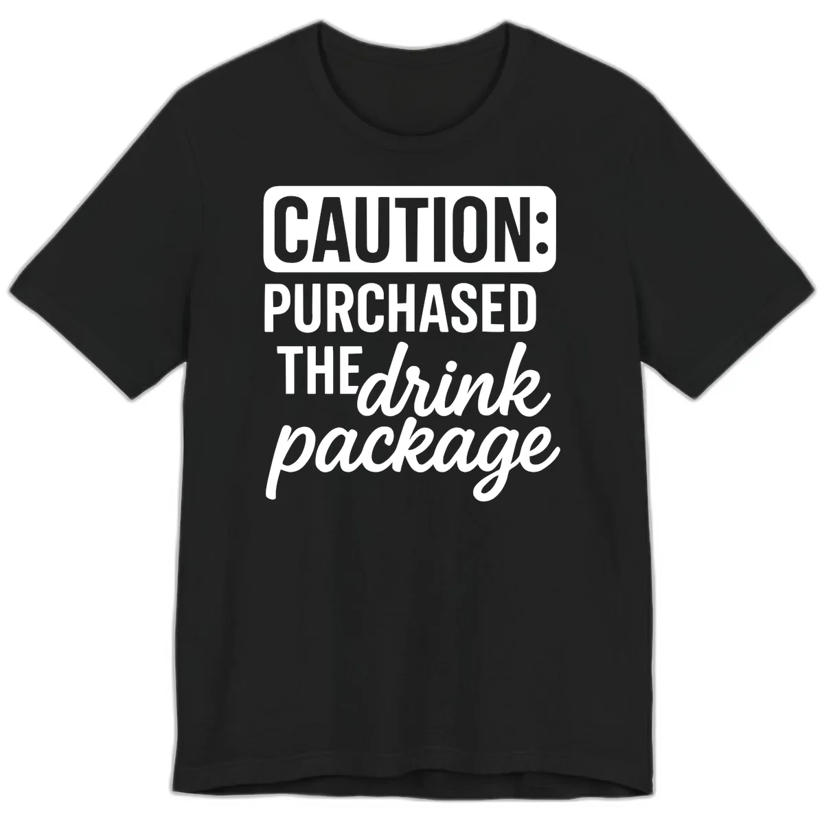How does the 'Caution: Purchased The Drink Package' design look on a premium tee?