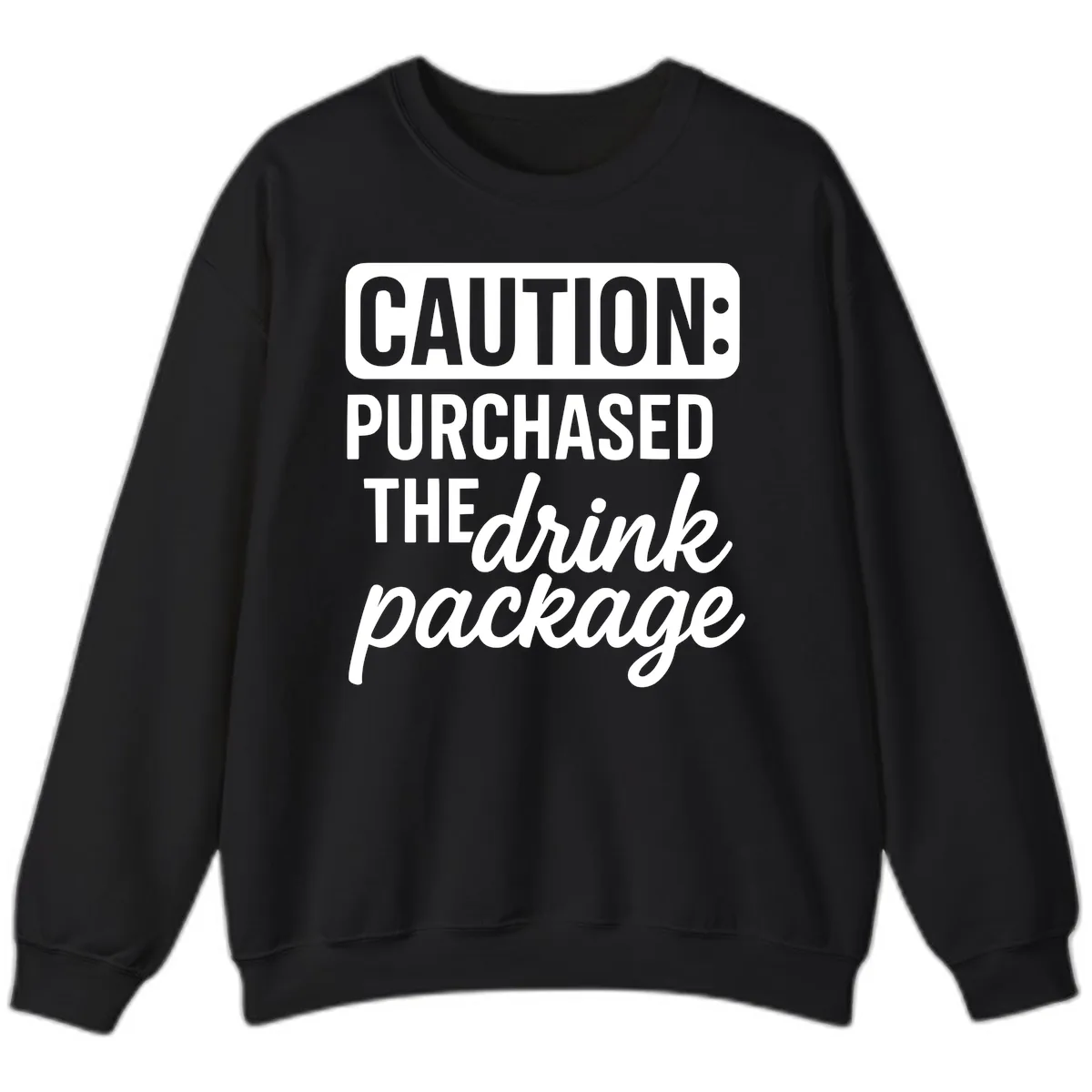 How does the 'Caution: Purchased The Drink Package' design look on a sweatshirt?