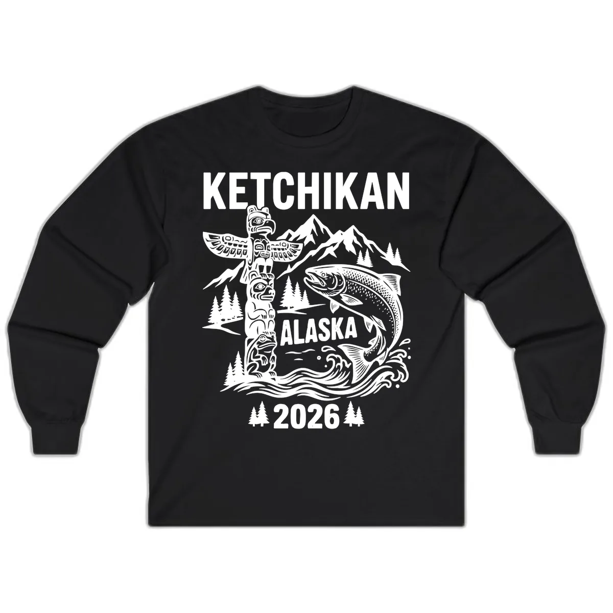 The striking monochromatic design, featuring the totem pole, salmon, mountains, and forests, is beautifully displayed across the long sleeves. The 'KETCHIKAN ALASKA 2026' text is prominently placed to showcase your destination.