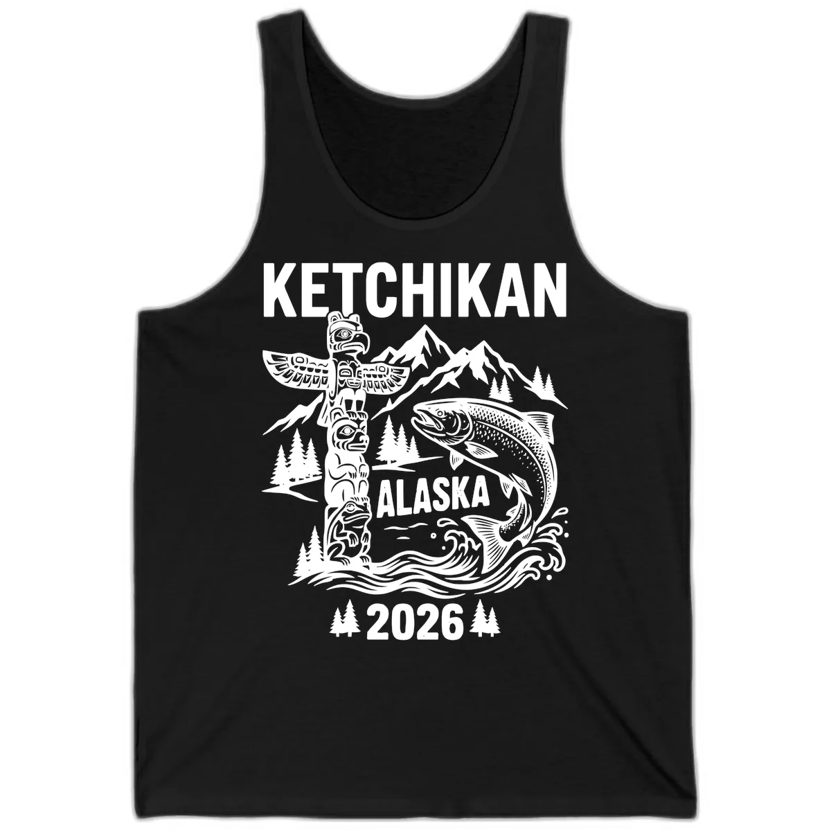 The striking monochromatic design, featuring the totem pole, salmon, mountains, and forests, translates beautifully onto the tank top. The 'KETCHIKAN ALASKA 2026' text is clearly visible, making it a great way to remember your trip.