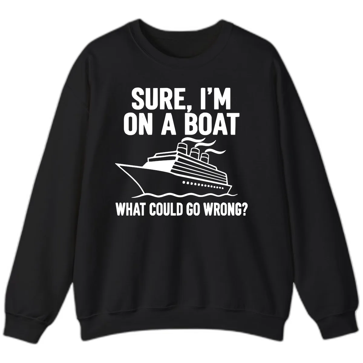 The bold 'SURE, I'M ON A BOAT WHAT COULD GO WRONG?' text and the cruise ship illustration are printed clearly on the sweatshirt, maintaining the comedic impact of the design.