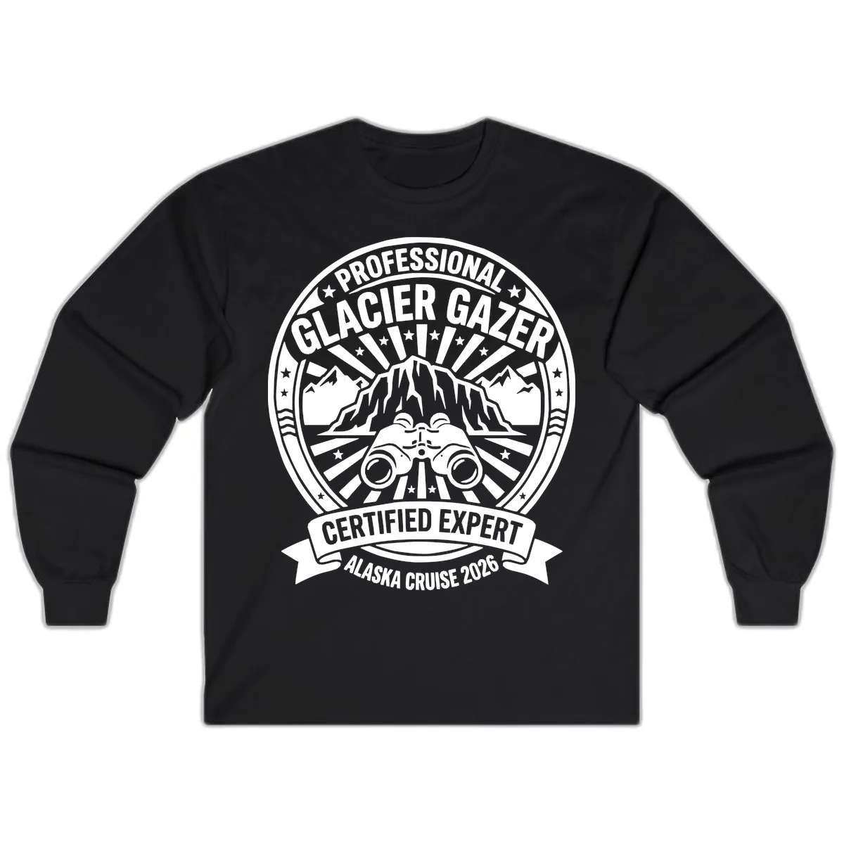 The Long Sleeve tee is perfect for layering and provides extra warmth on cooler Alaska cruise days or evenings. It features the same fun 'Professional Glacier Gazer Certified Expert Alaska Cruise 2026' badge design.
