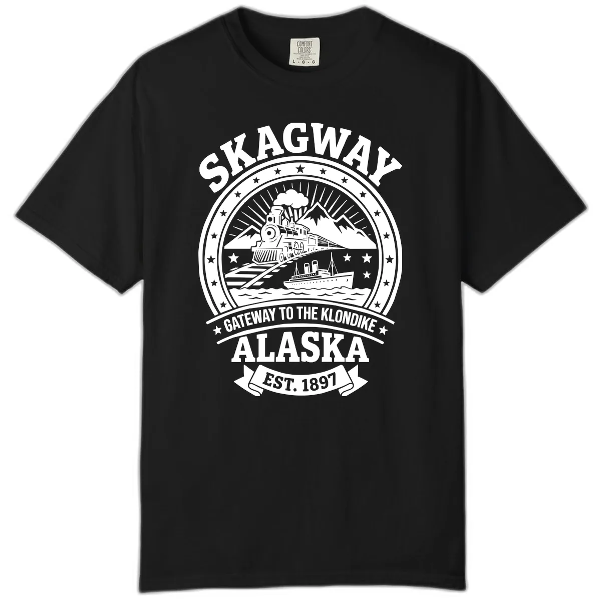 Wrap yourself in the history of the Klondike with our Skagway Gateway to the Klondike Comfort Color tee. This shirt embodies the rugged charm of Alaska's Gold Rush past, presented in a vintage-style circular badge that’s as timeless as the tales of adventure.
