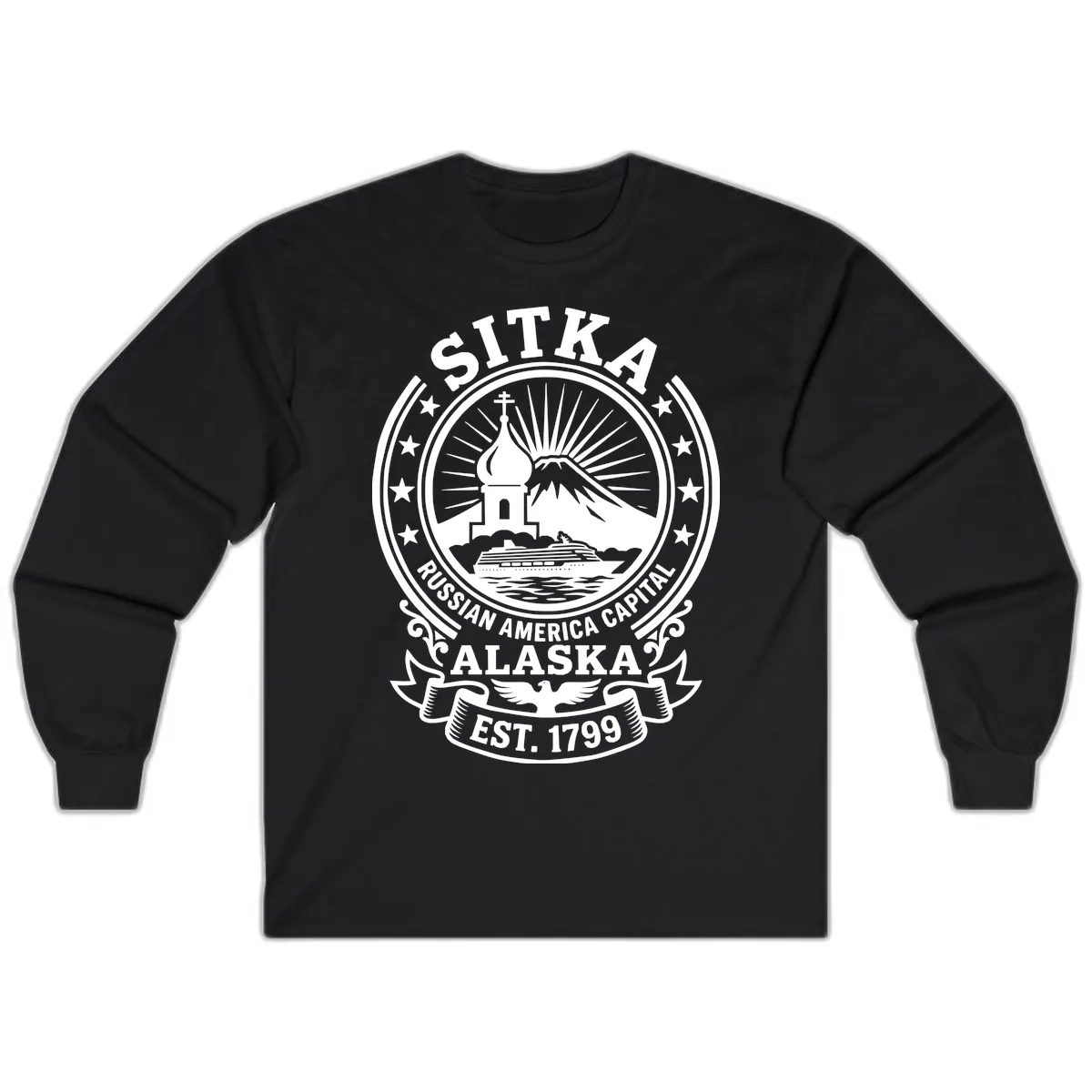 The detailed vintage badge design, featuring the Russian Orthodox church, mountain, and historical text 'SITKA RUSSIAN AMERICA CAPITAL ALASKA EST. 1799', is prominently displayed on the chest or back, ensuring the historical theme is well-represented.