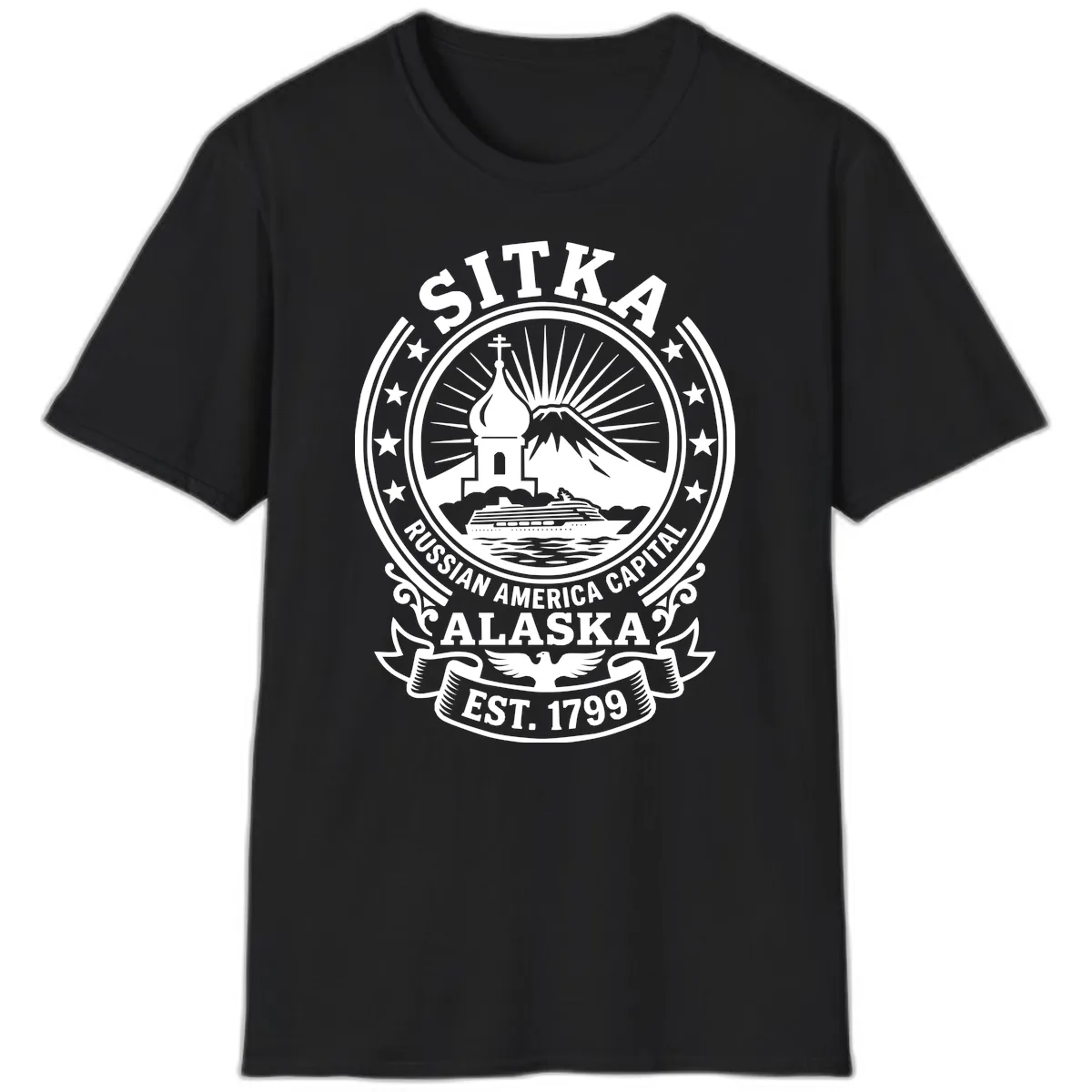Yes, the design explicitly states 'ALASKA EST. 1799', highlighting Sitka's historical significance as the former capital of Russian America. This adds an educational and commemorative element to the shirt.