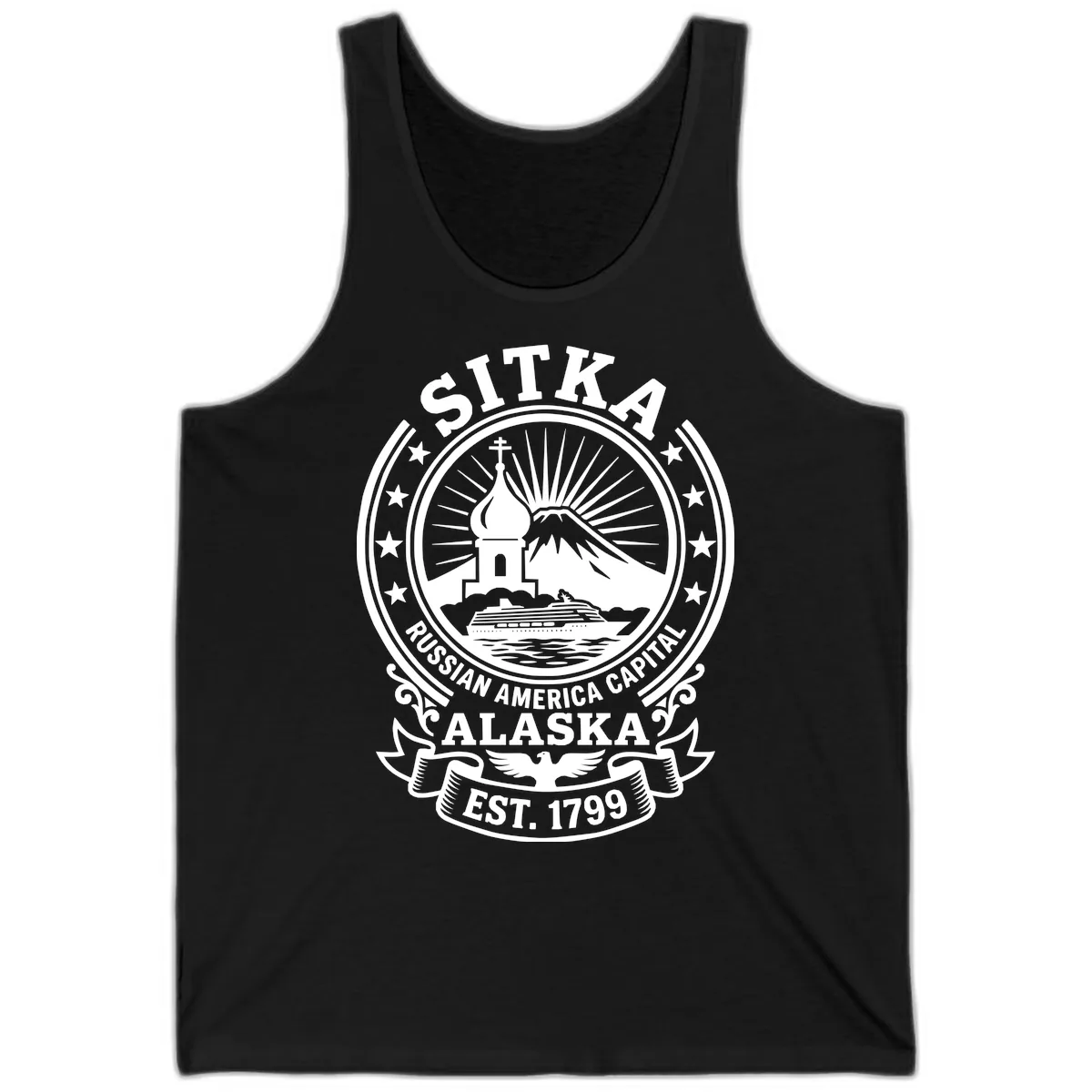 The detailed vintage badge design, 'SITKA RUSSIAN AMERICA CAPITAL ALASKA EST. 1799', featuring the Russian Orthodox church, mountain, and cruise ship, is printed clearly on the front of the tank top, making a distinctive statement.