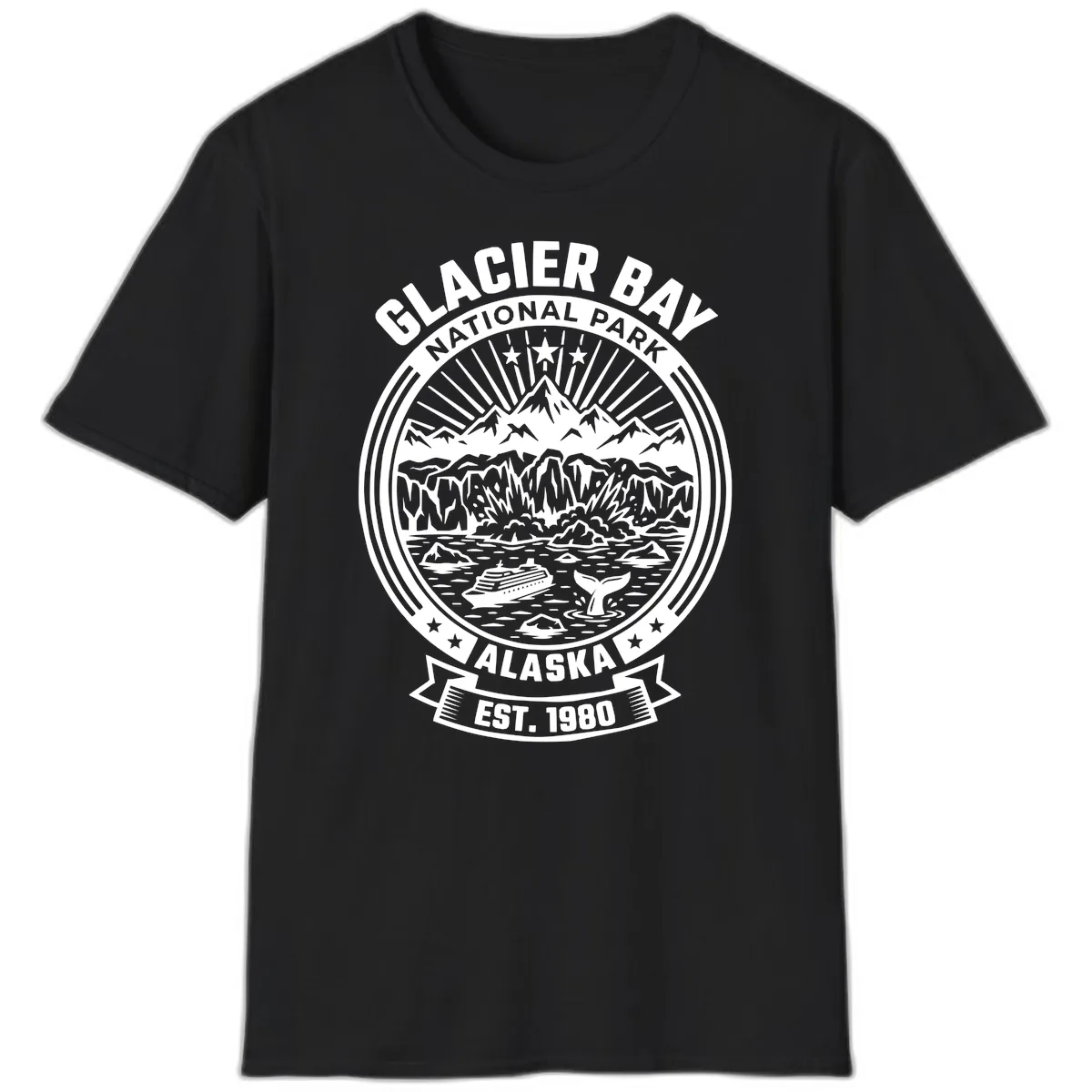 Is the 'ALASKA EST. 1980' text prominent on the Glacier Bay National Park t-shirt?
