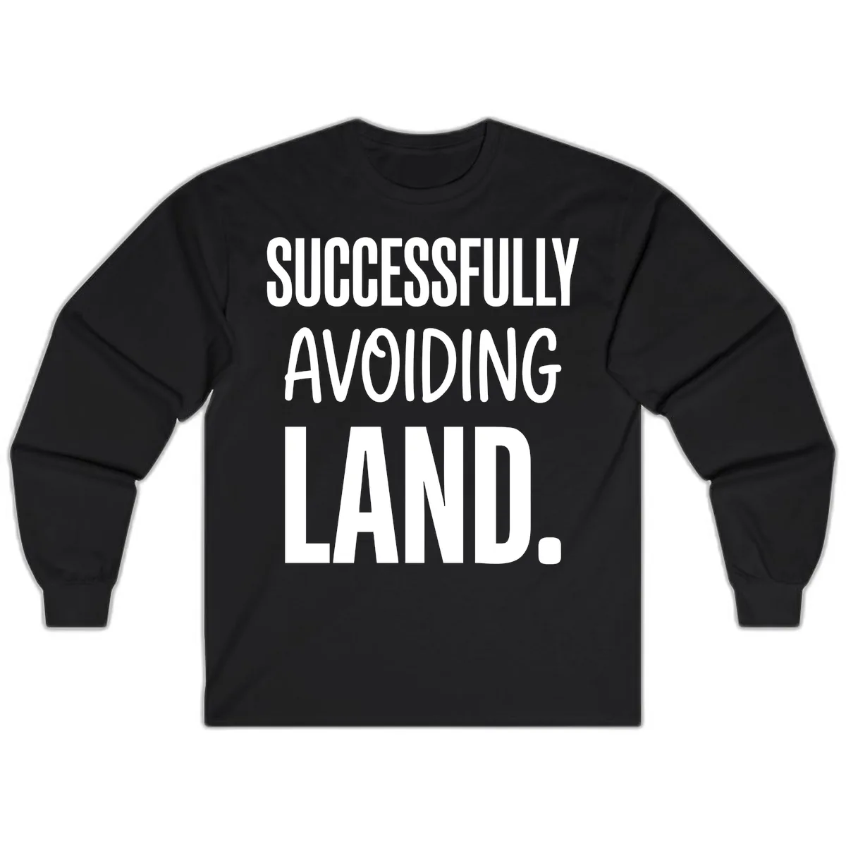 The bold, white 'SUCCESSFULLY AVOIDING LAND.' typography is prominently displayed, ensuring the humorous message is clear and impactful on the longer sleeves and body of the shirt.