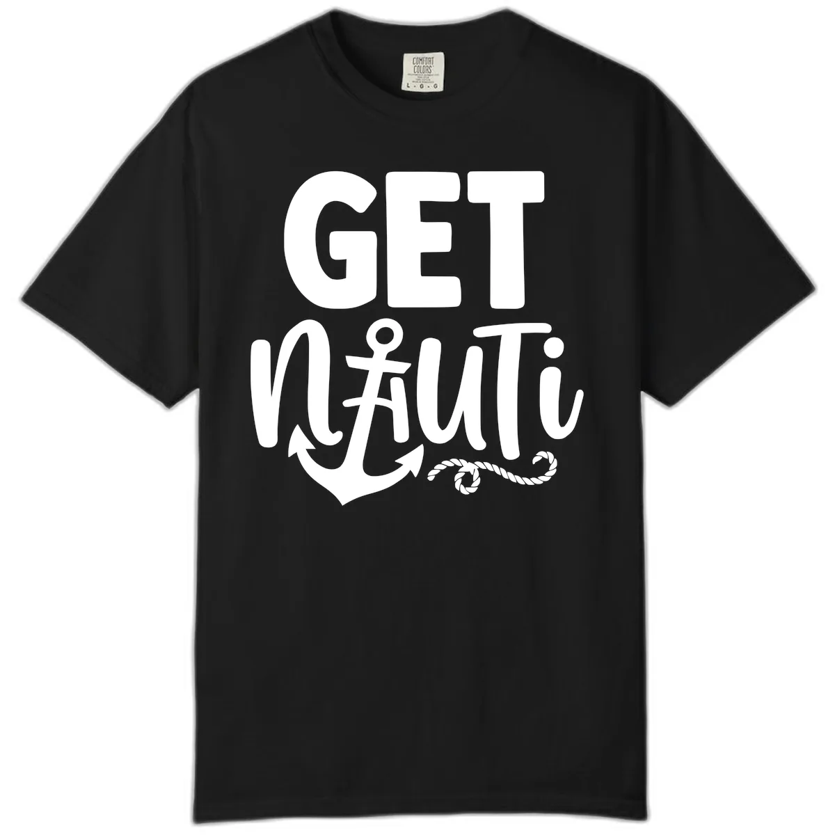 The bold 'GET NAUTICAL' text, anchor, and cross symbol are printed to complement the unique, washed-out look of Comfort Colors. The design pops with a relaxed, vintage vibe that's perfect for a laid-back cruise.