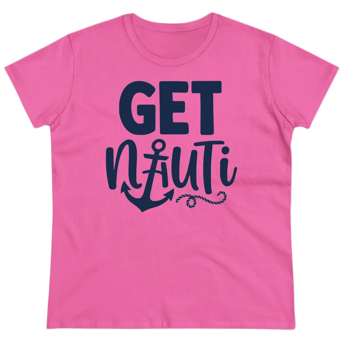 This Ladies Tee typically features a comfortable neckline, designed to be flattering and easy to wear. It pairs well with necklaces or can be worn simply on its own, showcasing the 'Get Nautical' graphic.