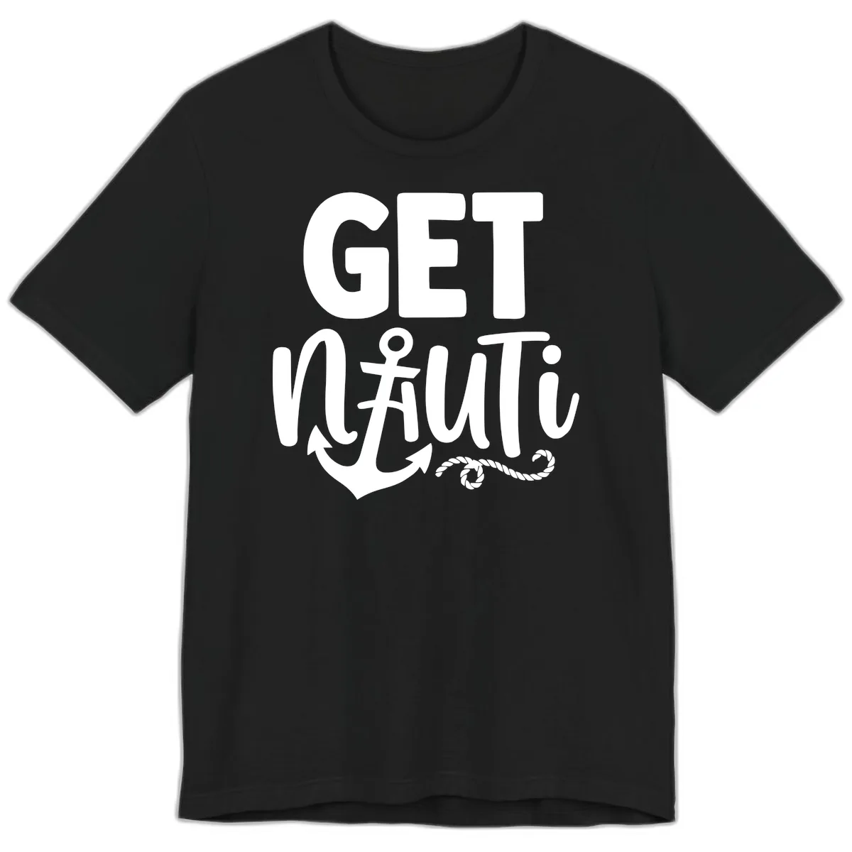 The bold white 'GET NAUTICAL' text, anchor, cross symbol, and rope details are printed to stand out vividly on the premium fabric. The design is crisp and clear, ensuring the maritime message is well-received.