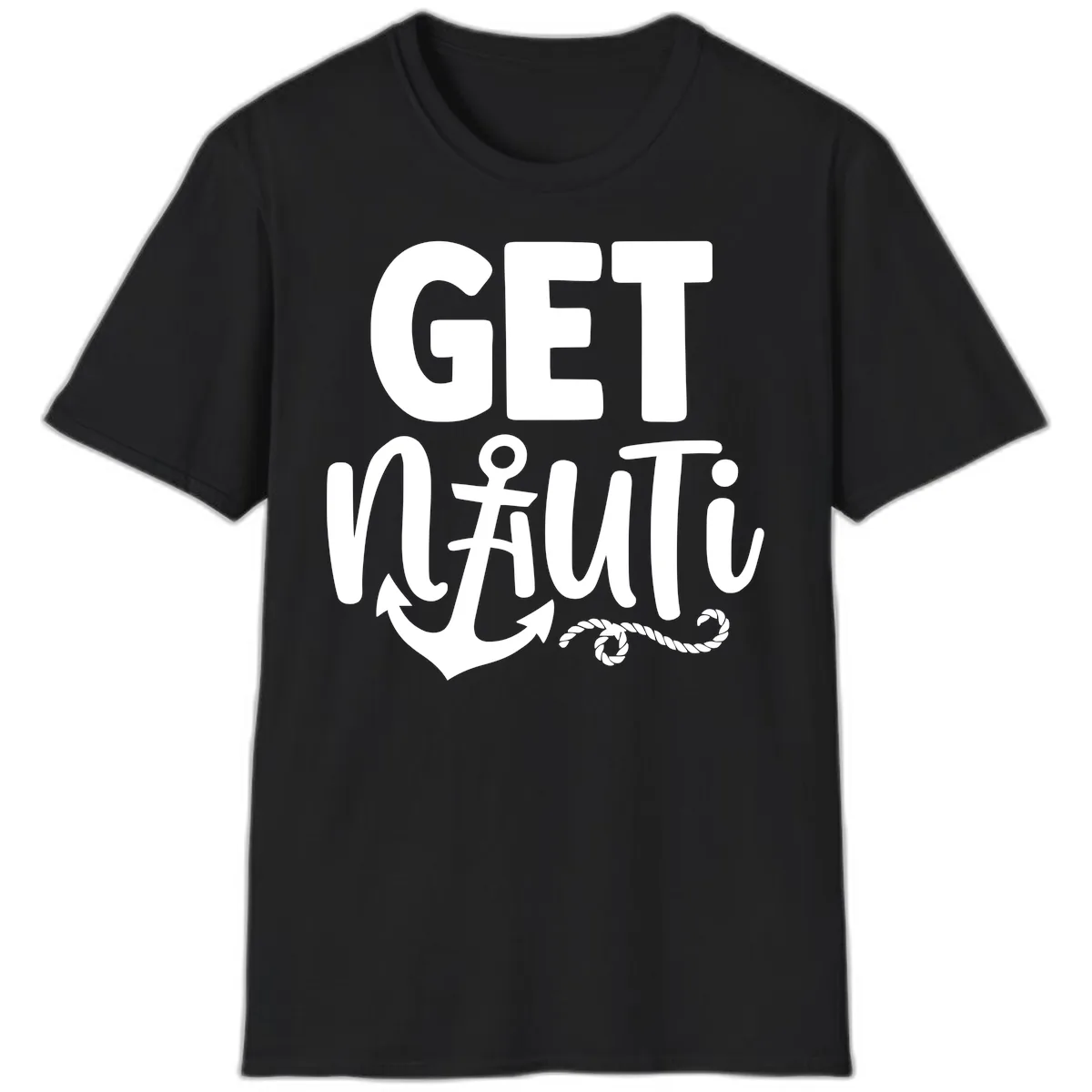 This classic unisex T-shirt features our unique 'Get Nautical' design. It boldly spells out the phrase with an anchor integrated into the 'A' and a cross symbol, all accented with rope details on a gray background, perfect for your cruise adventure.