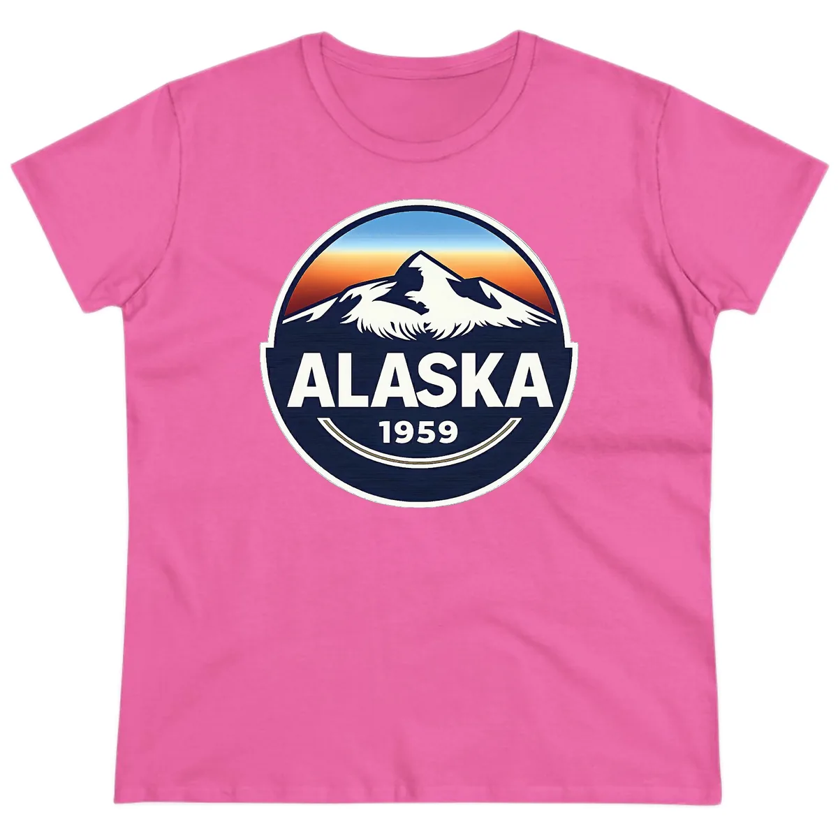 Cruise in style with the Alaska Statehood Badge 1959 Ladies Cruise Tee! This flattering tee showcases our popular vintage badge design, featuring a stunning snow-capped mountain against a beautiful sunset gradient. The 'ALASKA 1959' text is elegantly displayed on a navy banner, celebrating the state's iconic heritage. Designed with a feminine fit, this tee offers both comfort and a chic, adventurous look for your Alaskan journey.