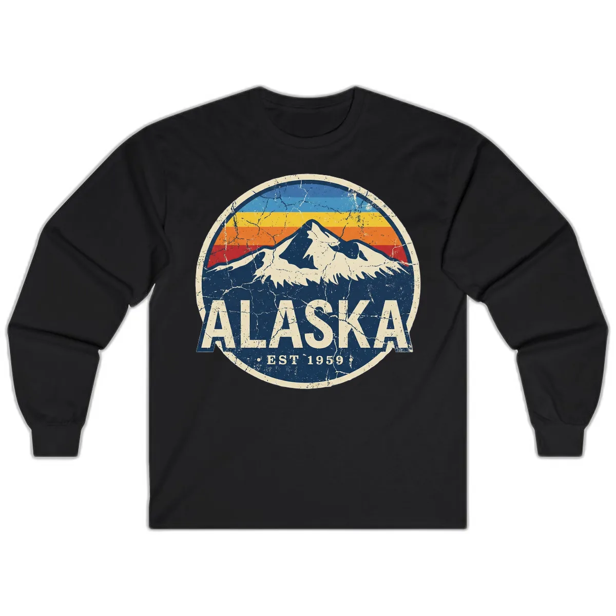 The Alaska Mountain Retro Badge design, with its mountain silhouette, retro rainbow stripes, and distressed texture, looks fantastic on the long sleeves. It offers a prominent display of your Alaskan spirit, suitable for any time of day.