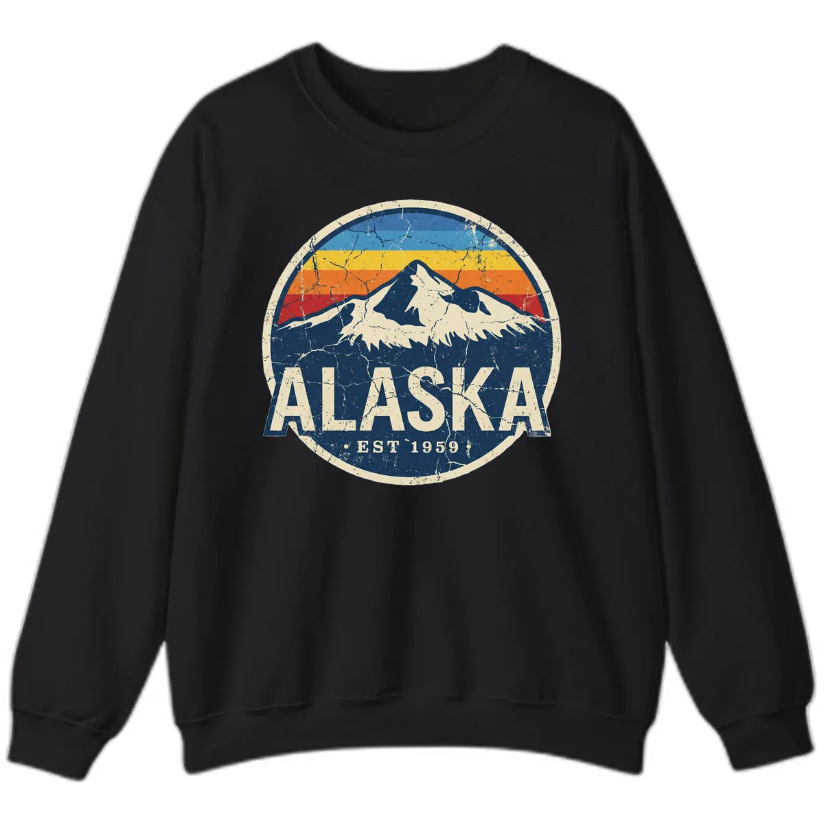 The vintage-inspired Alaska Mountain Retro Badge design, with its detailed mountain silhouette and retro rainbow stripes, looks fantastic on our cozy sweatshirt. The distressed texture adds to the classic appeal, making it a standout piece for your cruise.