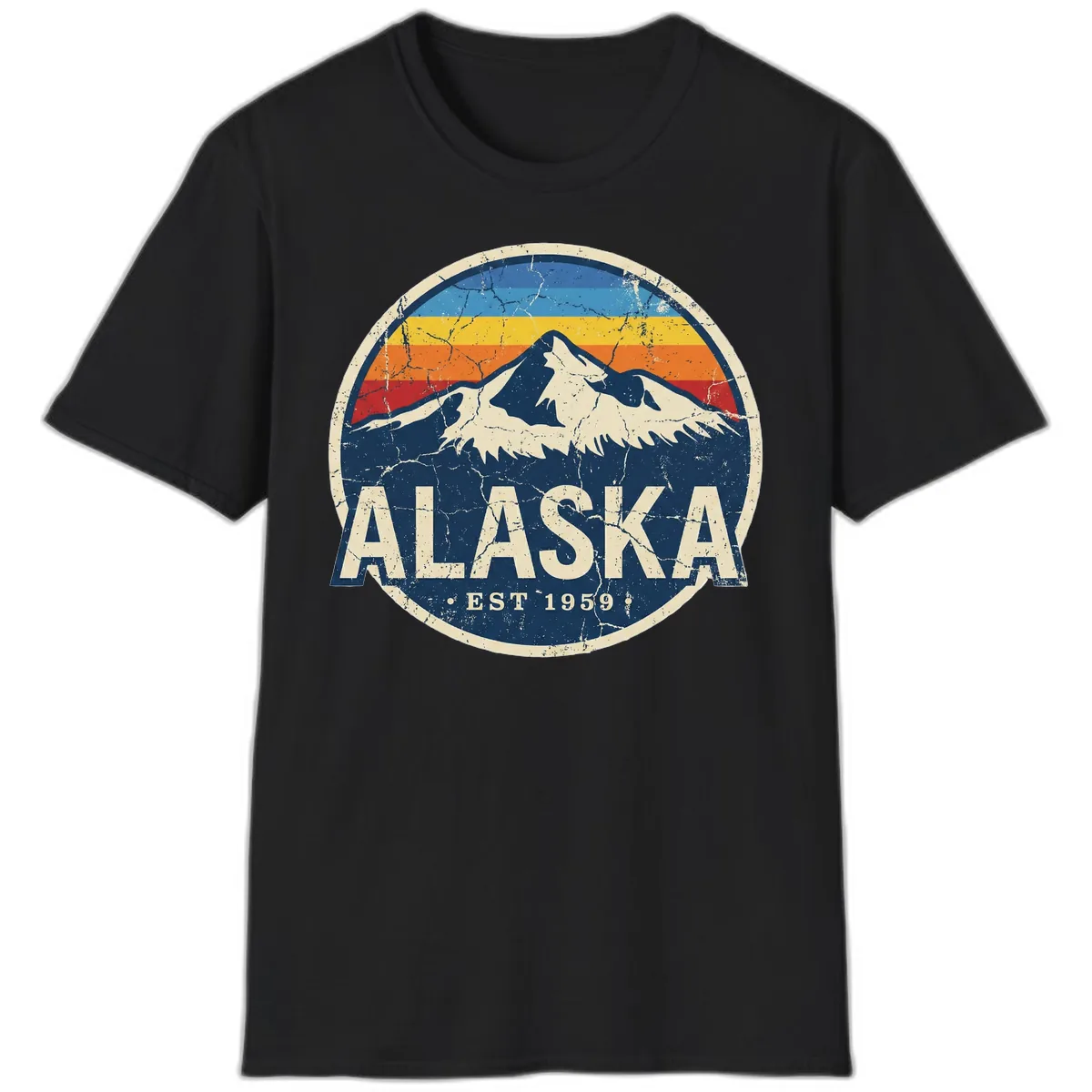 This t-shirt features a unique vintage-inspired circular badge design with a snow-capped mountain and retro rainbow stripes, perfect for capturing the spirit of your Alaska adventure. The 'ALASKA EST 1959' text adds a classic, established feel.