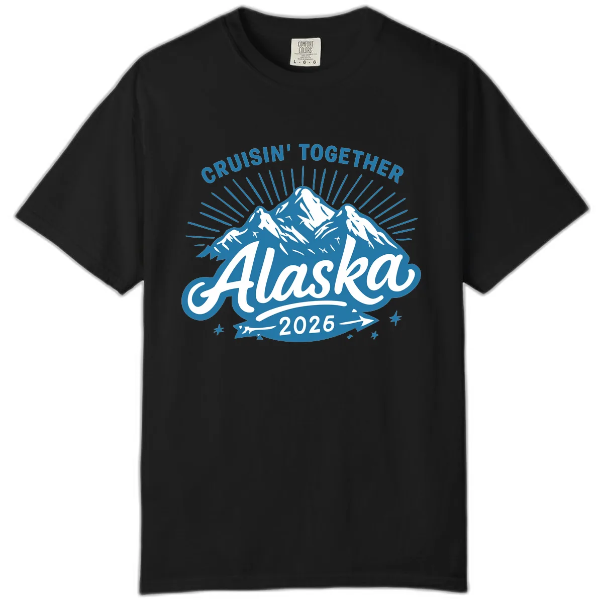 Embrace the spirit of adventure with the 'Cruisin' Together Alaska Mountains' Comfort Color tee, your perfect companion for the 2026 Alaska cruise season. This design showcases a breathtaking mountain landscape, complete with sun rays and stars, making it the ultimate symbol of your group's shared journey. Get ready to cruise in comfort and style!