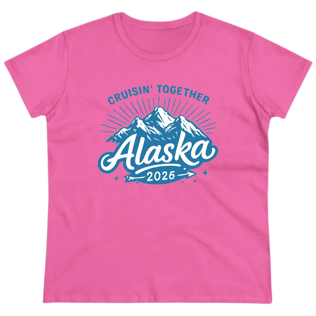 Set sail in style on your 2026 Alaska cruise with the 'Cruisin' Together Alaska Mountains' Ladies Tee. This design features a captivating mountain landscape, radiating sun rays, and the essential 'CRUISIN TOGETHER' message, all tailored for a flattering women's fit. It's the perfect way for your group to showcase their shared adventure and create lasting memories!