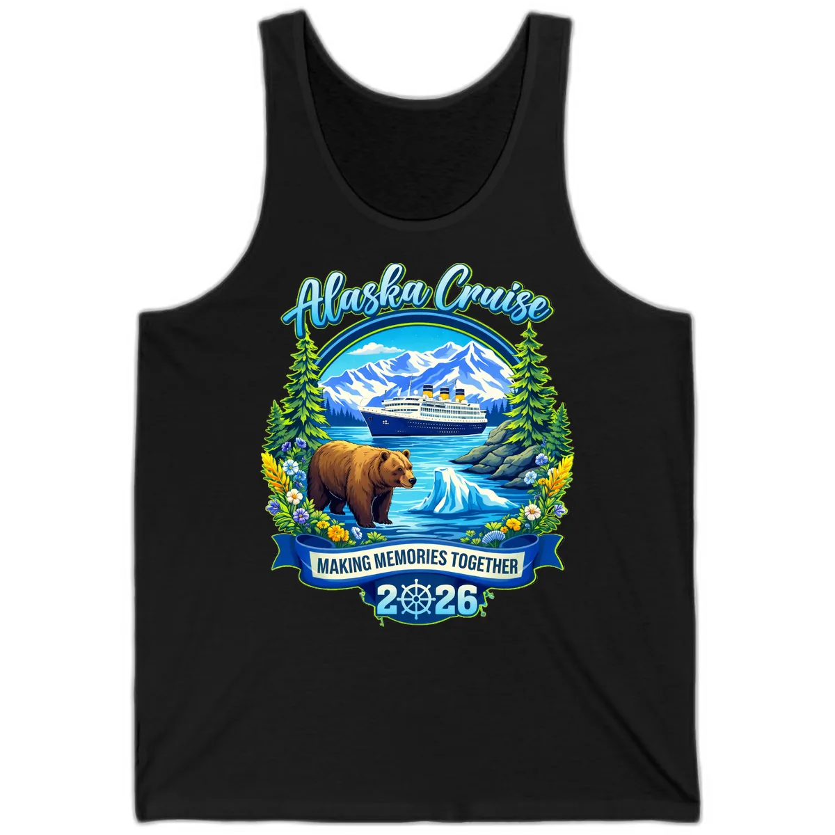 The vibrant scenic design, featuring the cruise ship, mountains, bear, and wildflowers, is printed clearly on the front of the tank. The 'Alaska Cruise,' 'Making Memories Together,' and '2026' text will be easily visible, showcasing your cruise spirit.