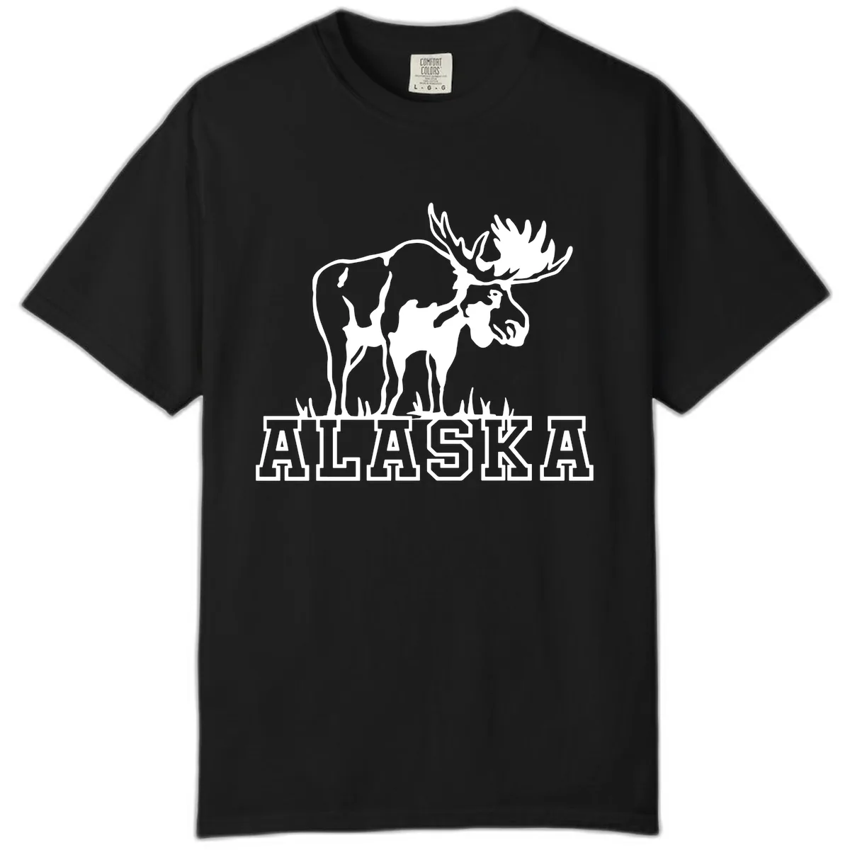 Yes, the bold white moose silhouette and 'ALASKA' text have a unique, slightly vintage look on the garment-dyed Comfort Colors fabric, adding character to the design.