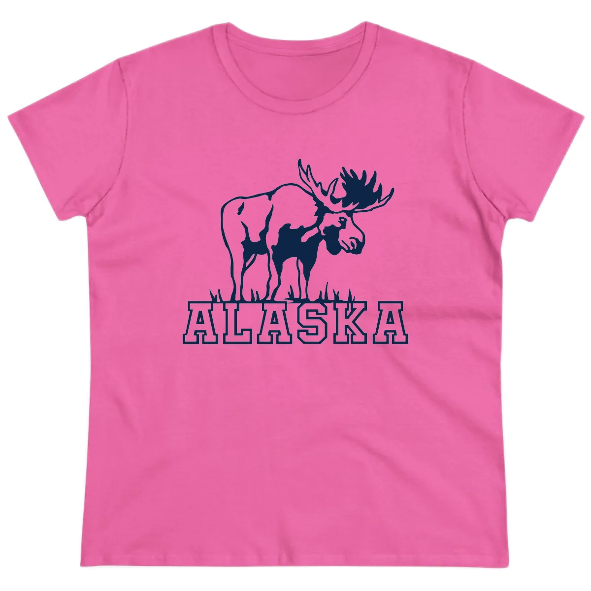 The Majestic Moose Alaska Wildlife design itself—the white moose silhouette and 'ALASKA' text—is the same, but it's presented on a cut specifically tailored for a feminine fit.