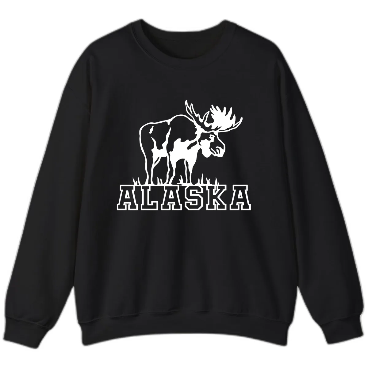 The Majestic Moose Alaska Wildlife design is typically printed directly onto the sweatshirt fabric, ensuring vibrant colors and clear details for the moose silhouette and 'ALASKA' text.