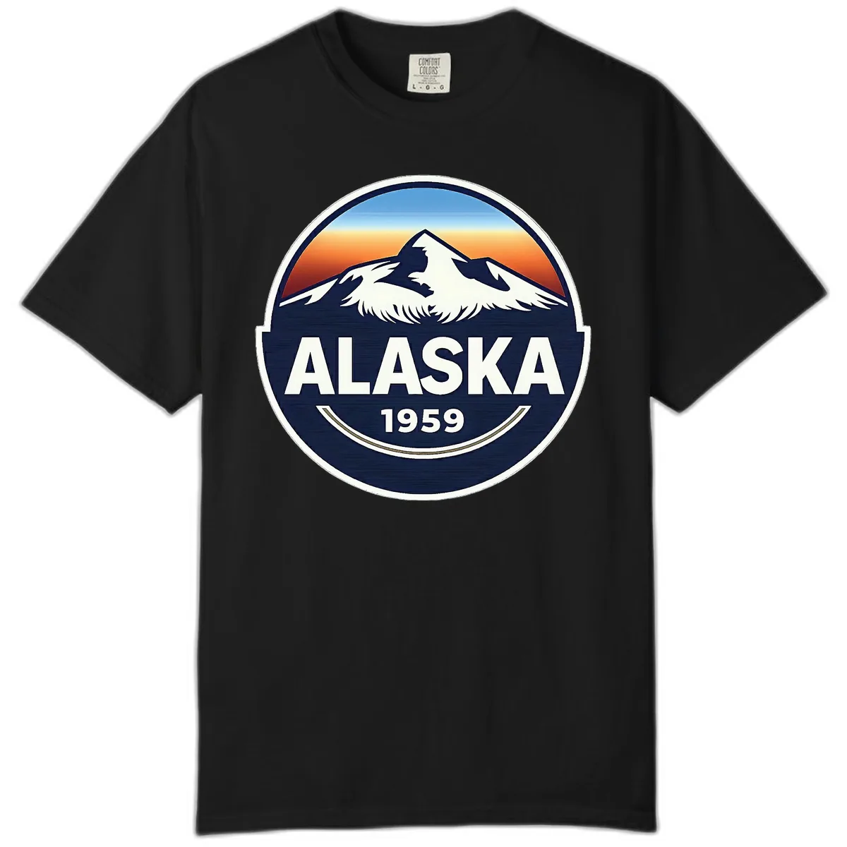The design features a circular badge with a snow-capped mountain, a sunset gradient, and the text 'ALASKA 1959' framed by a navy border.