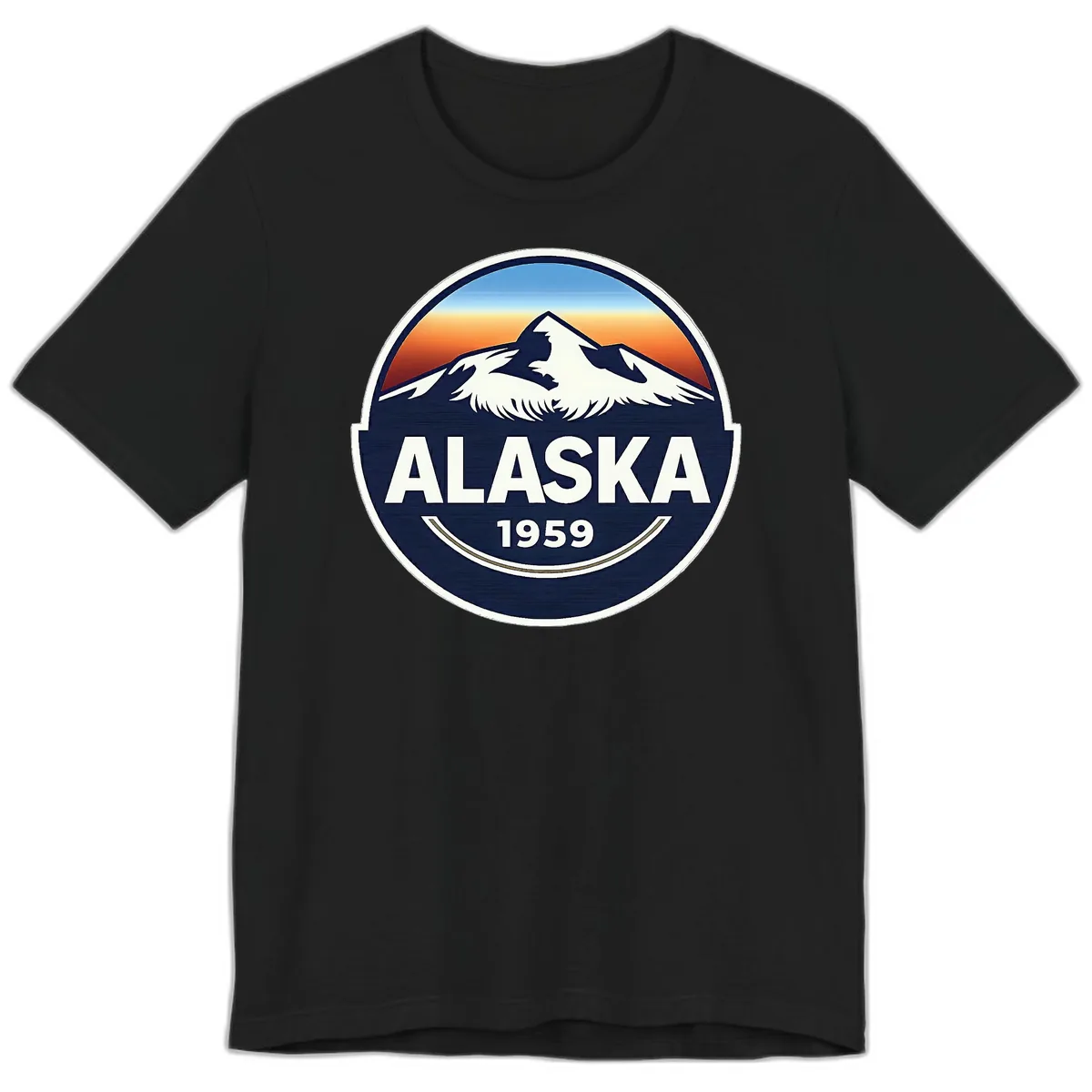 The Premium T-Shirt showcases the Alaska 1959 Snow Peak Badge design, featuring a vintage-style circular emblem with a snow-capped mountain and sunset gradient.