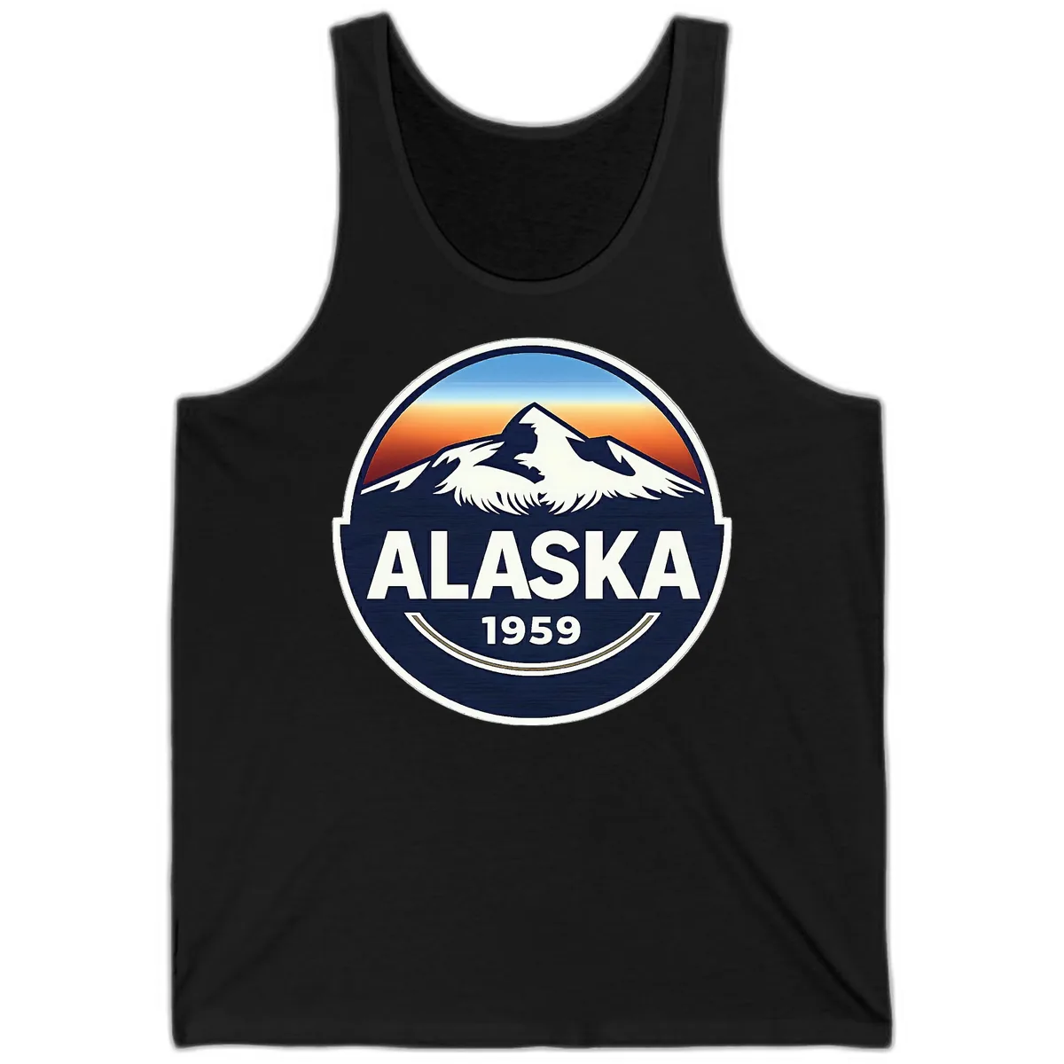 The tank features the distinctive circular badge design, showcasing a snow-capped mountain peak against a sunset gradient sky, with 'ALASKA 1959' text.