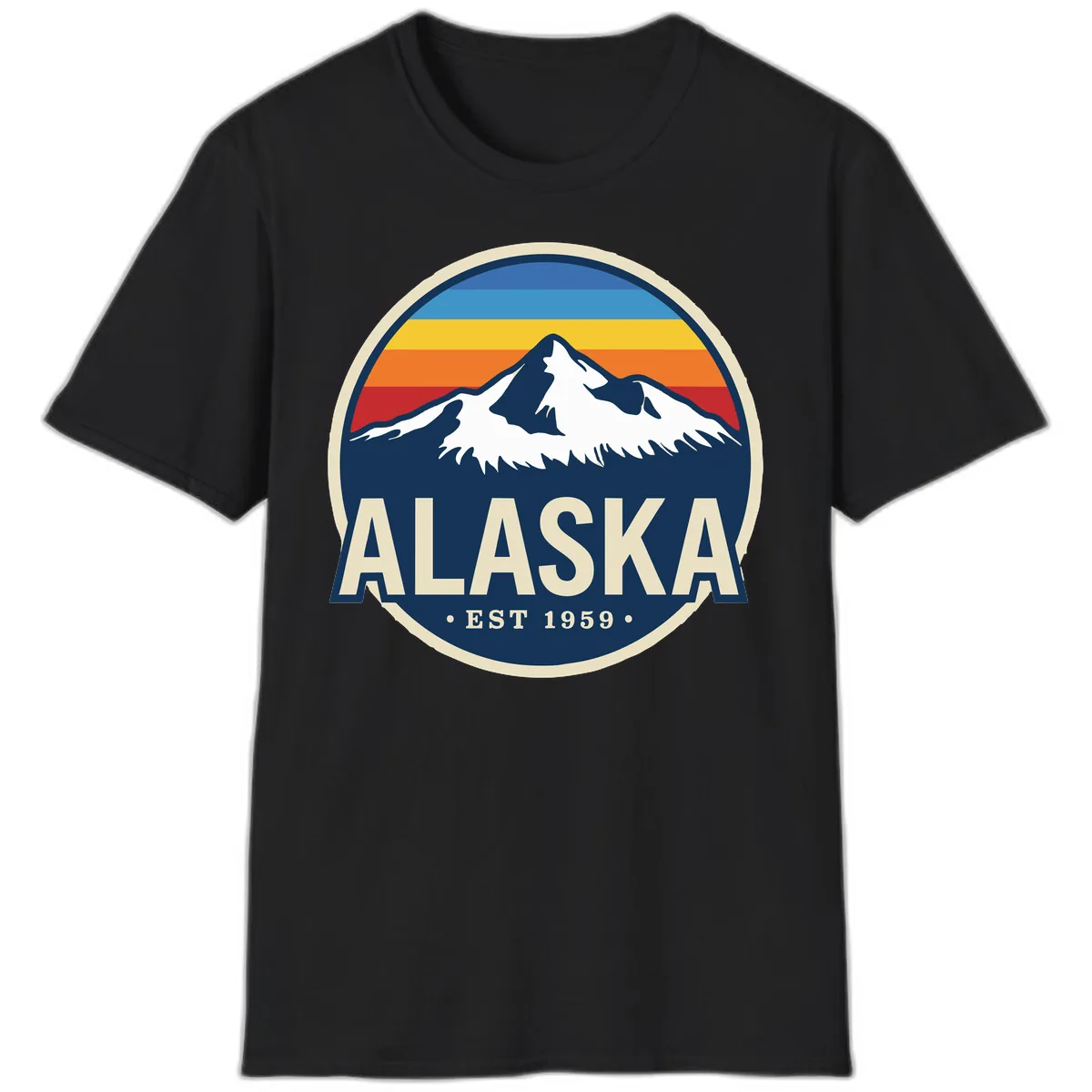 This t-shirt features a vintage-inspired circular badge design. It showcases snow-capped mountain peaks against a colorful, retro striped sunset, celebrating Alaska's iconic landscapes and its statehood established in 1959.