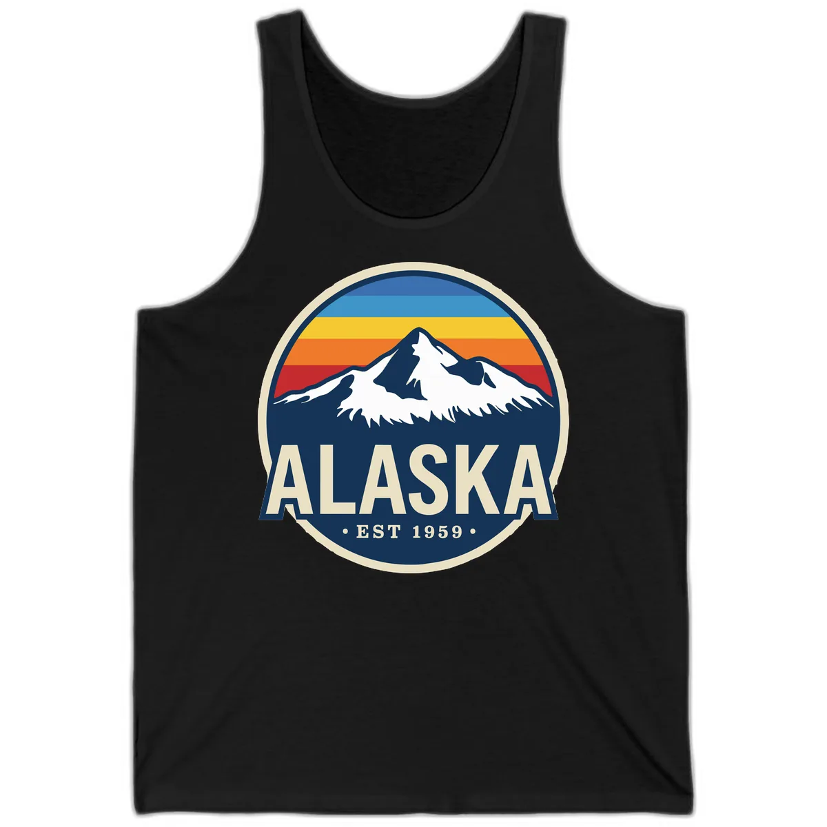Yes, the 'ALASKA • EST 1959 •' text is part of the retro badge design, celebrating Alaska's statehood. It adds a unique historical element to the fun, vacation-themed tank top, making it a great souvenir.