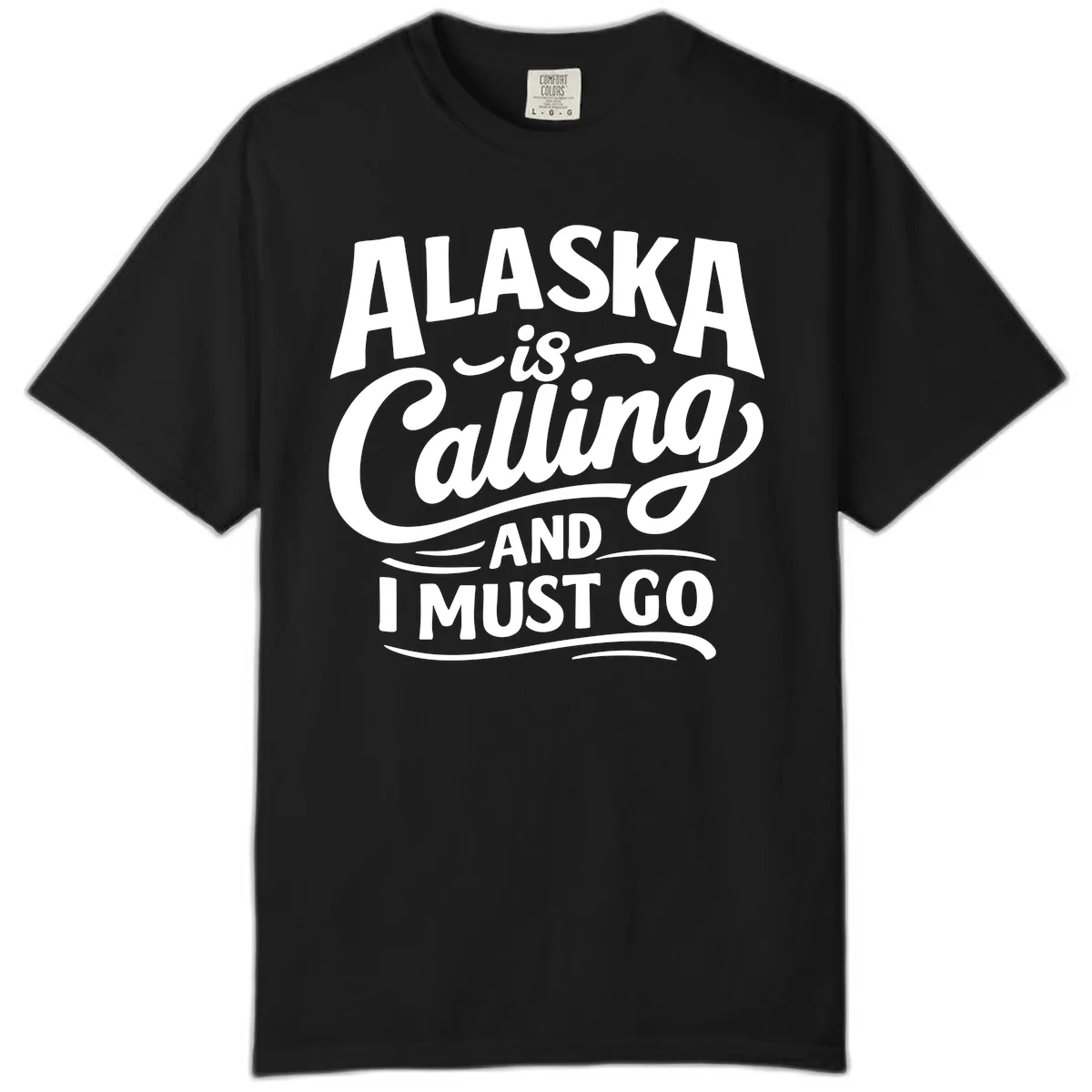The 'ALASKA is Calling AND I MUST GO' hand-lettered typography looks fantastic on the unique texture of Comfort Colors. The mixed fonts and decorative swirls create a vintage-inspired, artistic vibe.