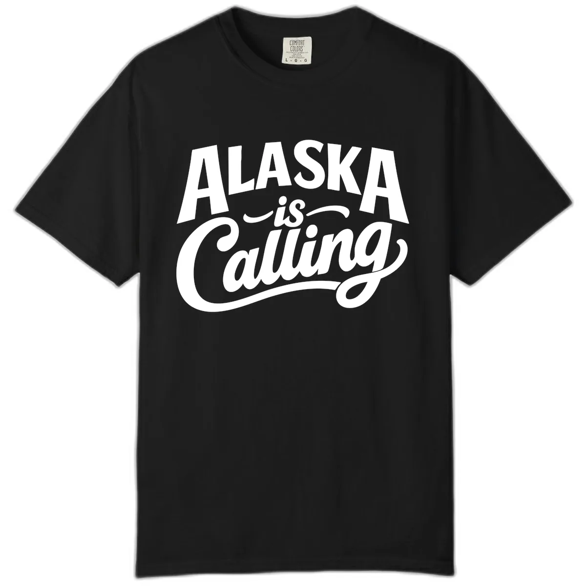 The mixed typography, with its bold 'ALASKA' and flowing 'is Calling' script, takes on a slightly vintage, characterful appearance due to the garment-dyeing process, adding to its charm.