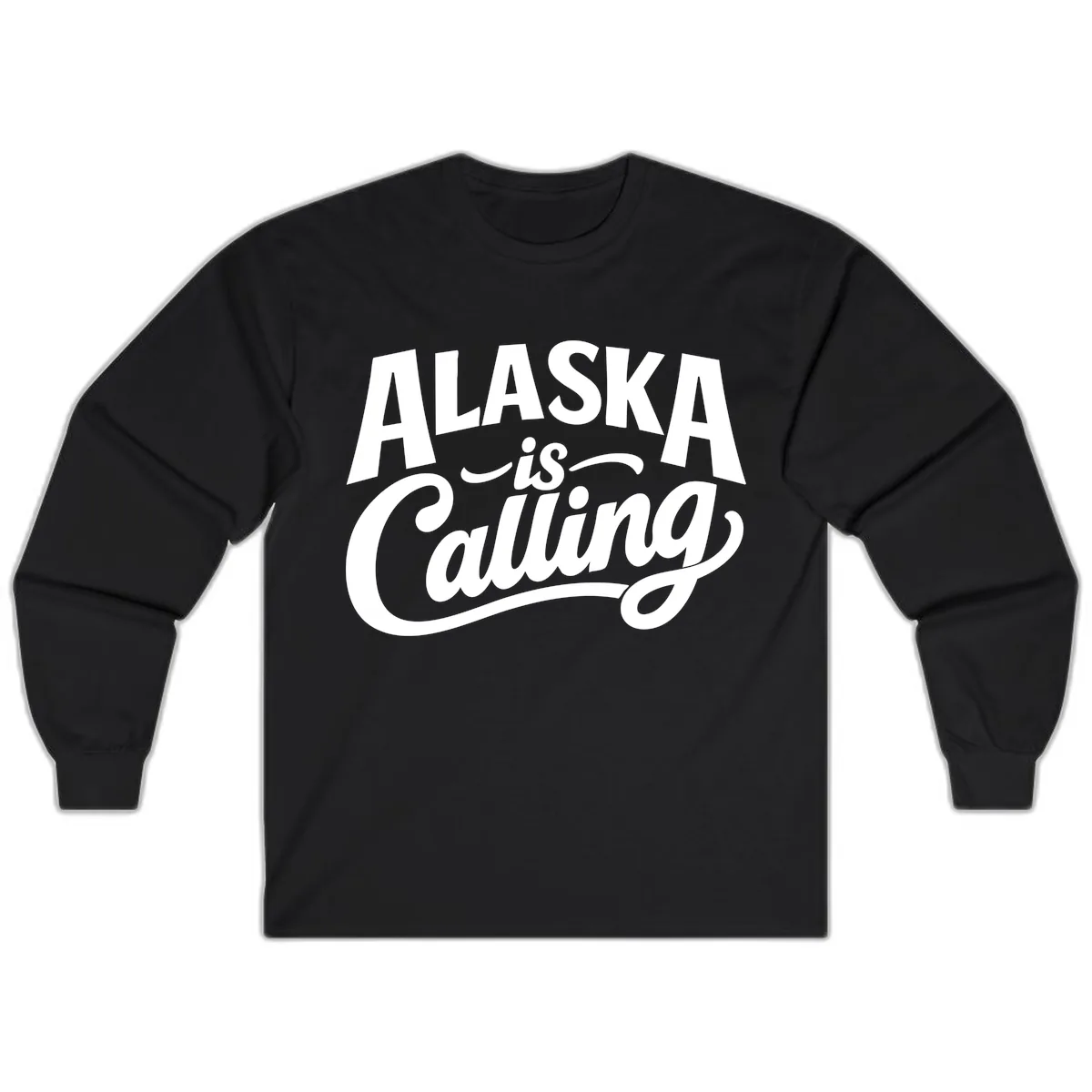 The mixed typography, with bold 'ALASKA' and elegant 'is Calling' script, looks fantastic on the longer canvas of this sleeve. It's a prominent design that suits the practical nature of a long sleeve.