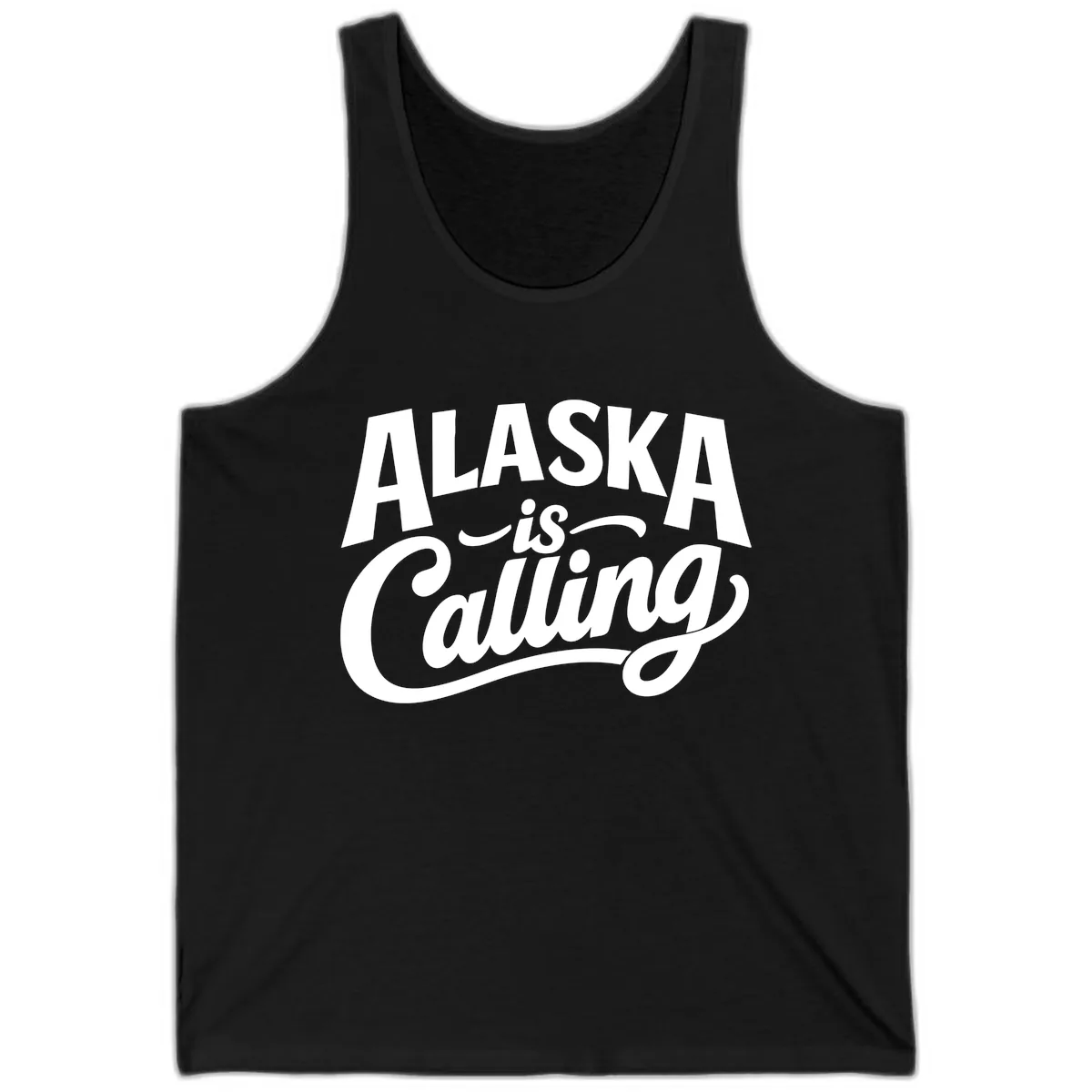 The 'ALASKA is Calling' graphic, with its bold 'ALASKA' text and elegant 'is Calling' script, is a vibrant focal point on the tank. It’s a fun way to show your travel spirit.