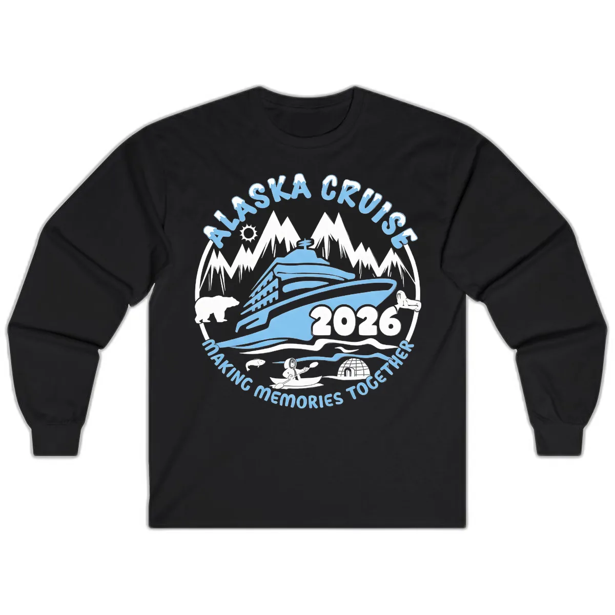 The detailed circular design, featuring the cruise ship, mountains, polar bear, igloo, and kayaker, is beautifully printed on the long sleeves. The text 'ALASKA CRUISE 2026 MAKING MEMORIES TOGETHER' arches around the graphic, making it a complete and eye-catching piece.