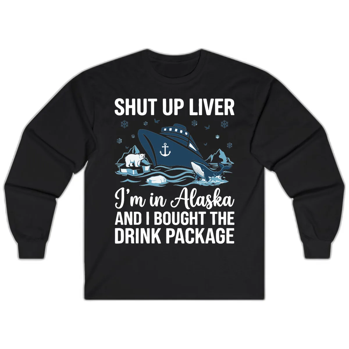 Chart your course for adventure with the Arctic Wildlife Voyage Graphic Long Sleeve. This design features a captivating illustration of a cruise ship navigating the stunning, icy waters of Alaska, complete with a dramatic breaching whale, a polar bear on a solitary iceberg, and imposing snowy mountain peaks. It’s the perfect way to keep the spirit of your Alaskan cruise alive, offering both warmth and a beautiful reminder of the incredible wildlife and landscapes you encountered.