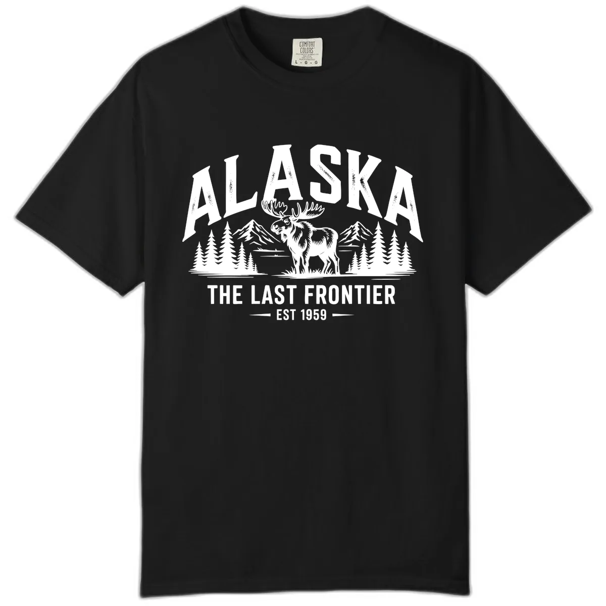 The detailed white illustration of the moose, mountains, and pine trees, along with the 'ALASKA THE LAST FRONTIER EST 1959' text, pops beautifully against the unique, washed-out hues of Comfort Colors fabric.