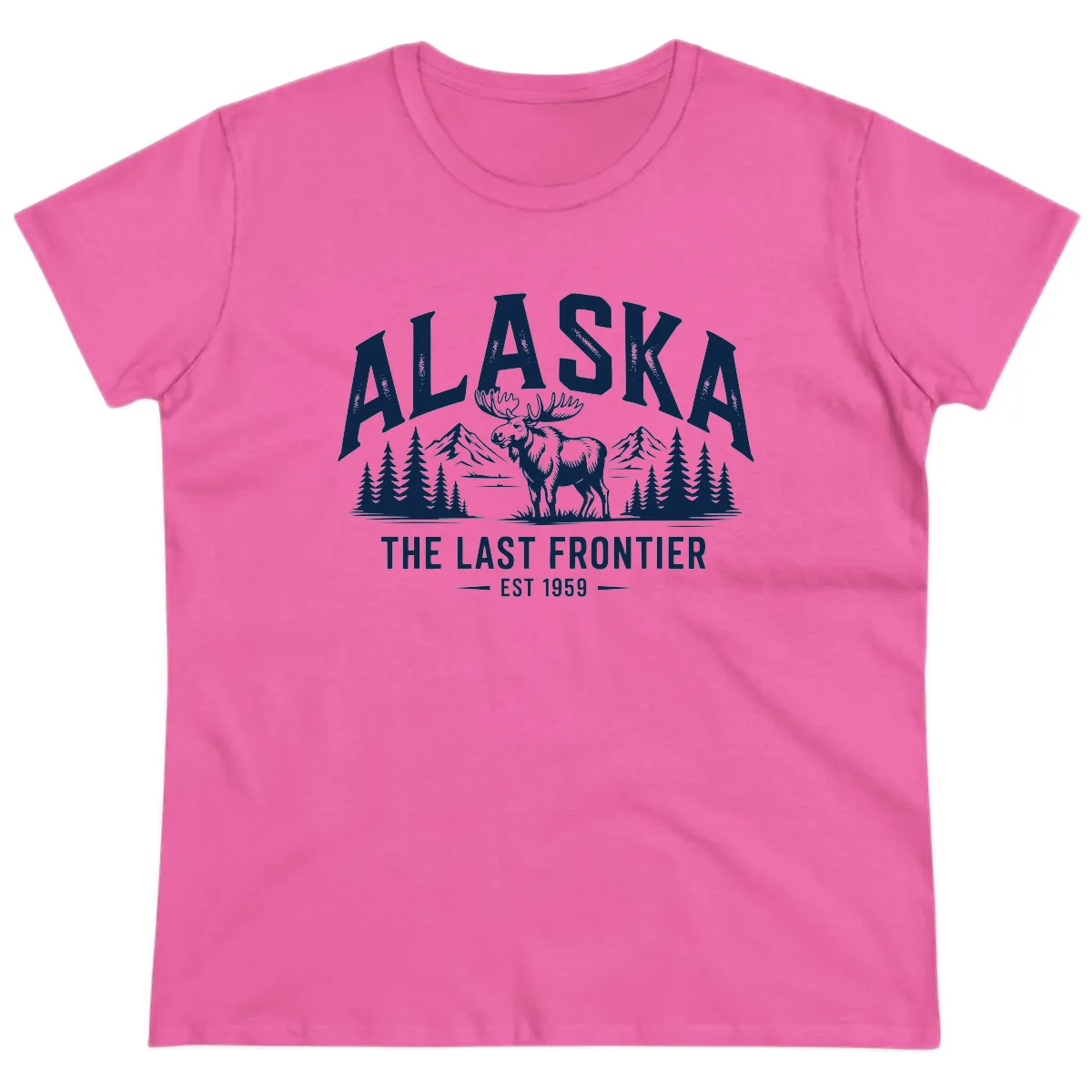 Embrace the spirit of adventure with our "Last Frontier Moose Scenic" Ladies Tee. This beautifully designed shirt features a captivating illustration of a moose and mountains, perfect for remembering your incredible Alaskan cruise. Cut for a flattering women's fit, it’s the ideal blend of style, comfort, and wanderlust.