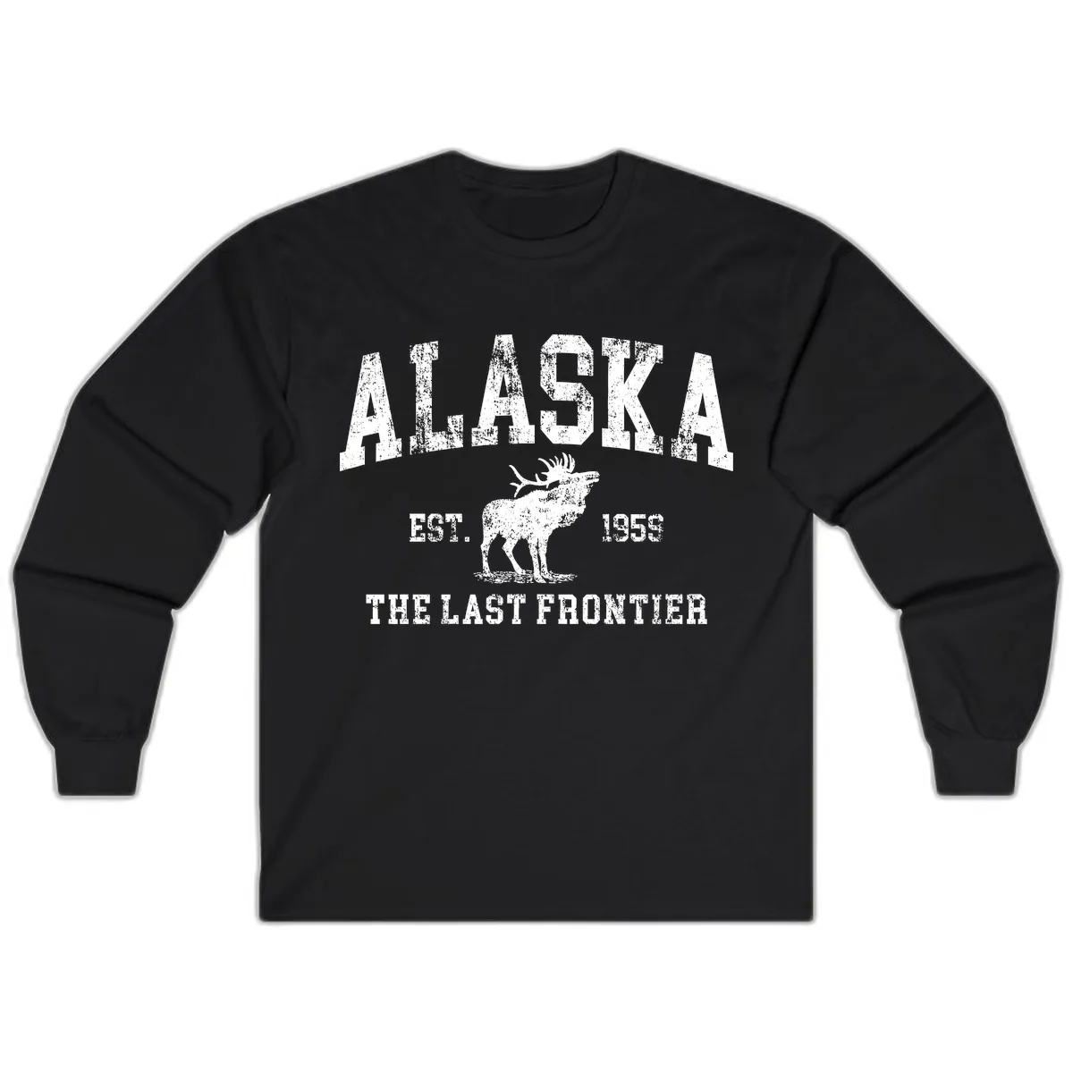 The distressed vintage moose graphic, featuring 'ALASKA EST. 1959 THE LAST FRONTIER', is prominently displayed on the front of the long sleeve tee. The design maintains its classic appeal on this versatile garment.